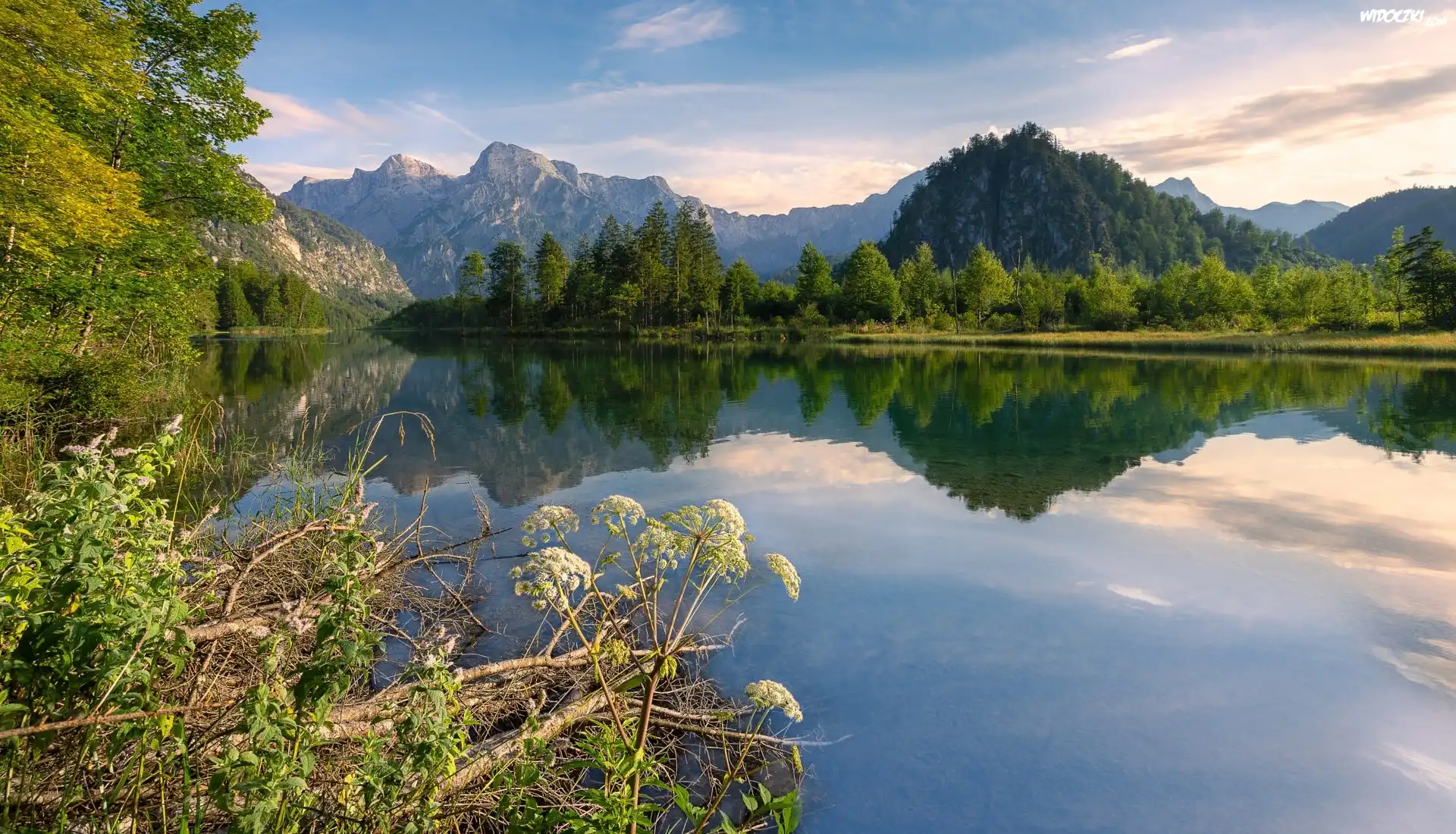 Góry, Jezioro Almsee, Odbicie, Drzewa, Chmury, Austria