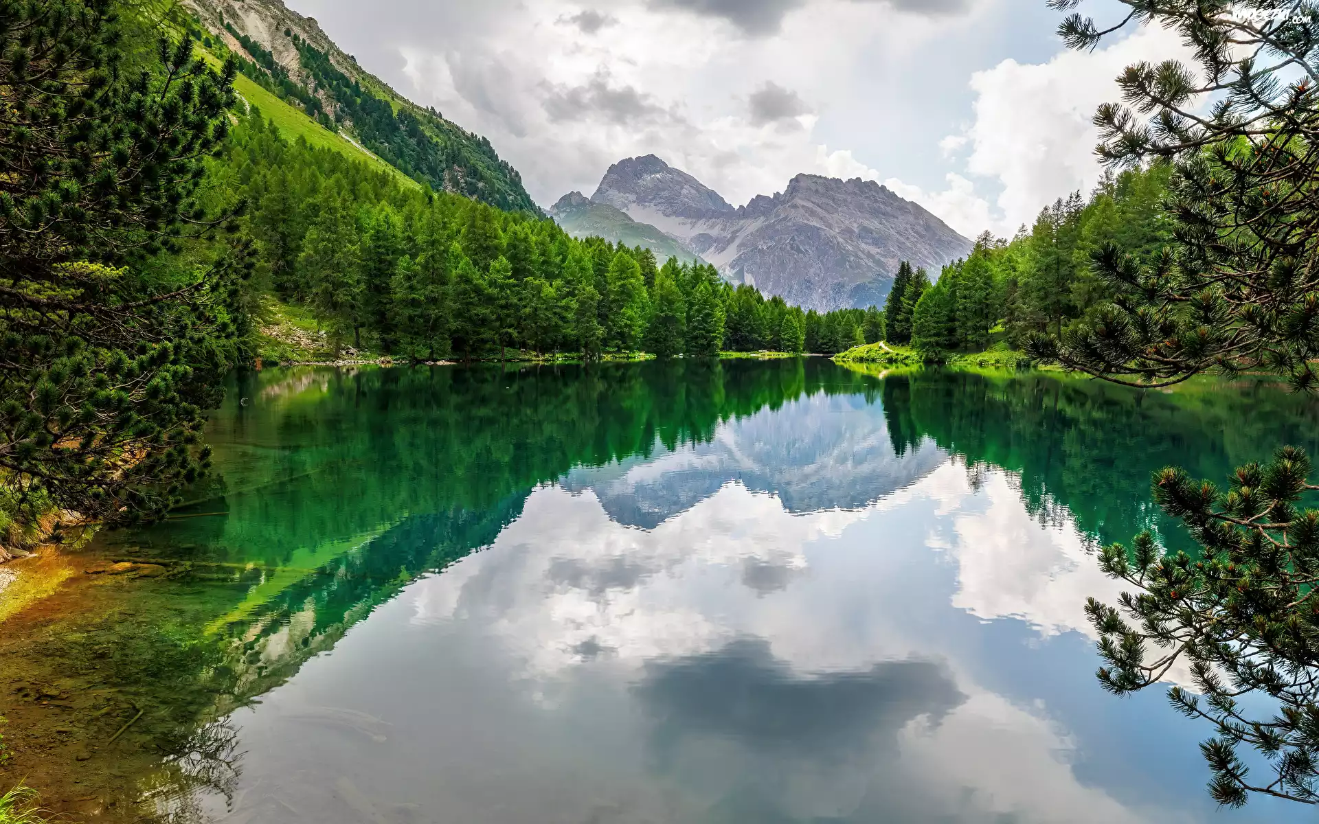 Szwajcaria, Góry, Alpy, Jezioro, Las, Drzewa, Chmury, Odbicie