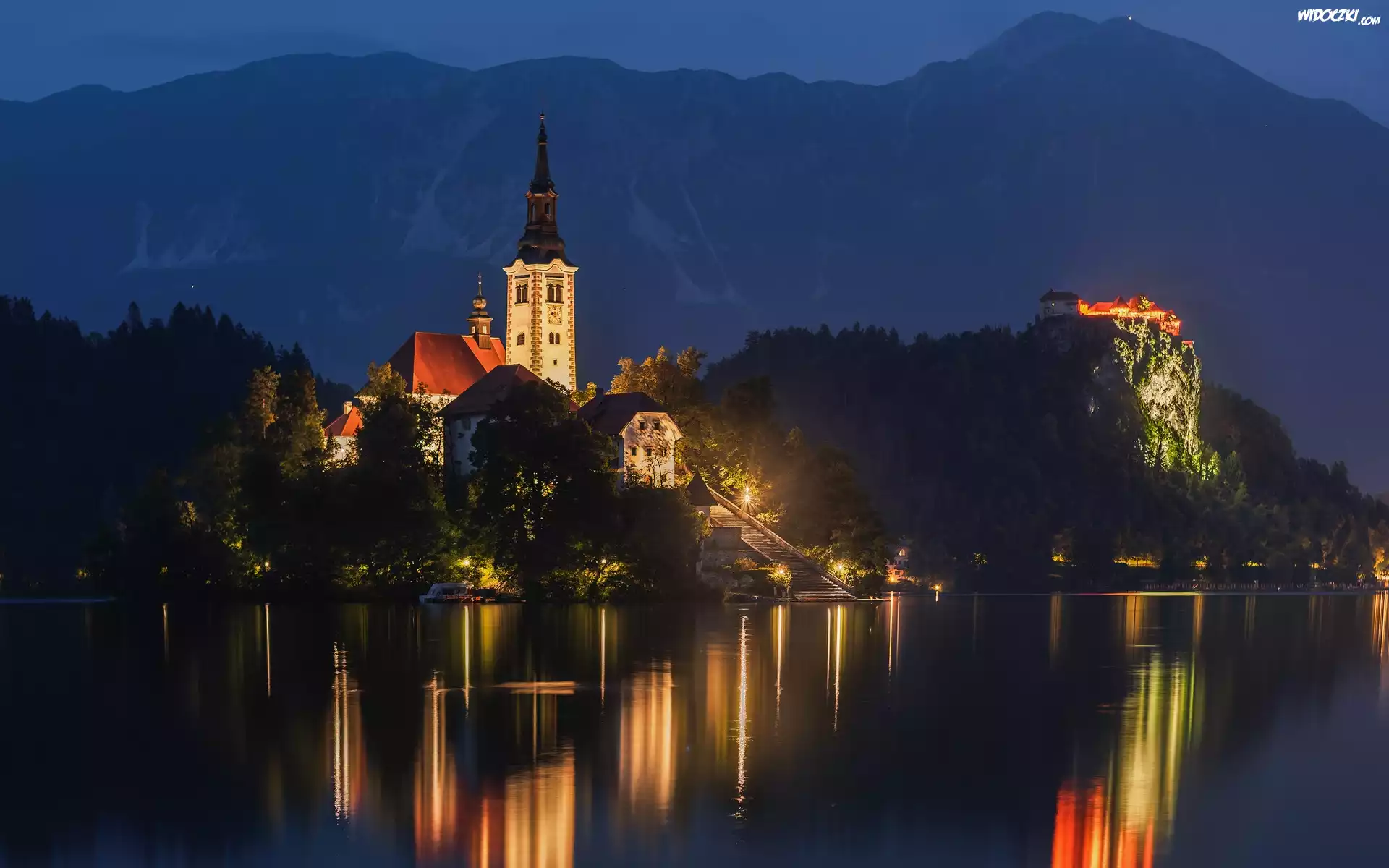 Zdjęcia, Słowenia, Jezioro Bled, Noc, Światła, Kościół, Góry, Odbicie