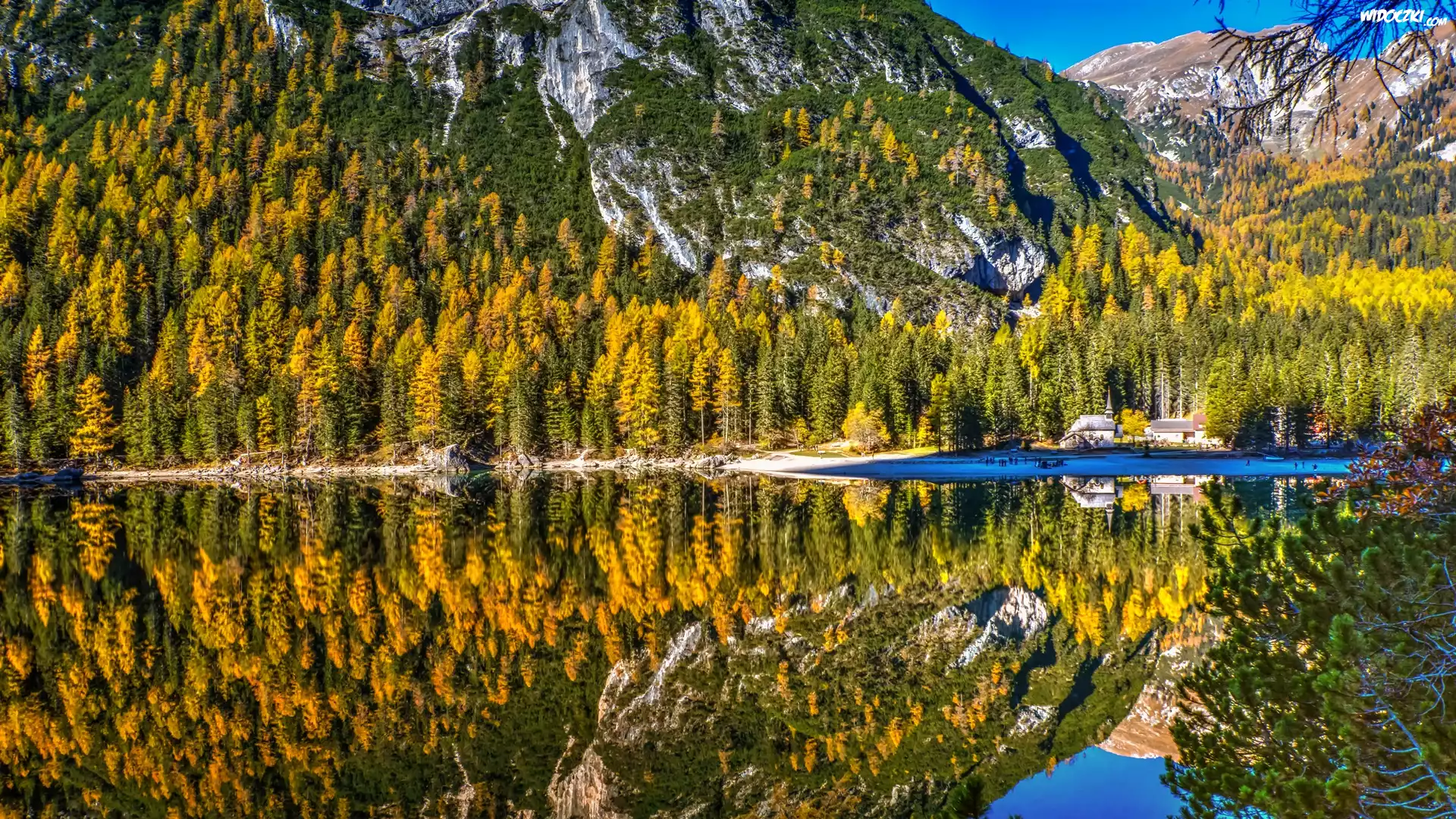 Włochy, Jezioro Braies - Pragser Wildsee, Góry, Las, Kościół, Odbicie
