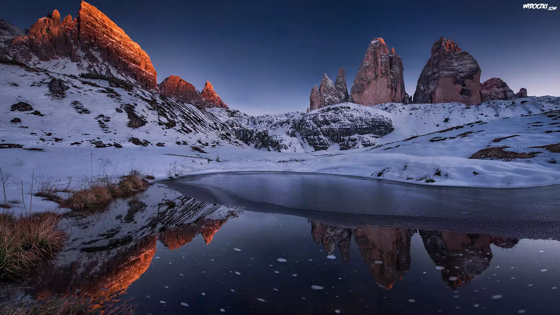 Zdjęcia, Jezioro, Zima, Odbicie, Góra Croda di Passaporto, Trzy szczyty, Dolomity, Włochy