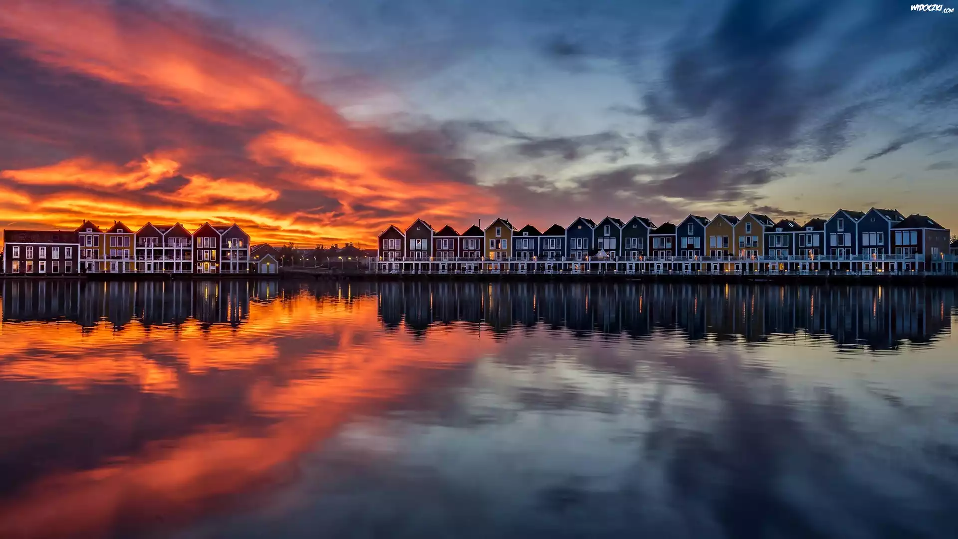 Zdjęcia, Holandia, Houten, Domy, Jezioro Rietplas, Zachód słońca, Niebo, Odbicie