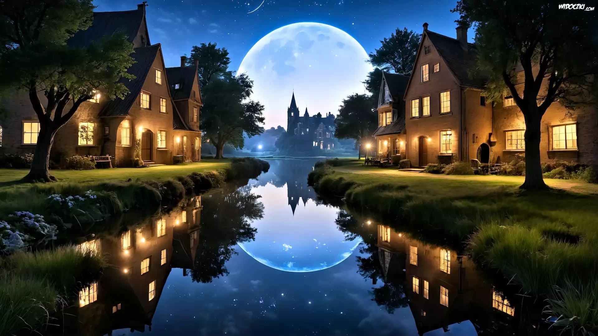 Grafika, Rzeka, Domy, Oświetlone, Noc, Księżyc, Drzewa, Odbicie