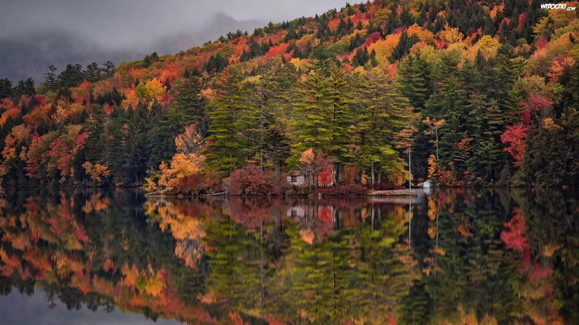 Zdjęcia, Jesień, Zalesiona, Góra, Kolorowe, Drzewa, Jezioro, Domy, Odbicie