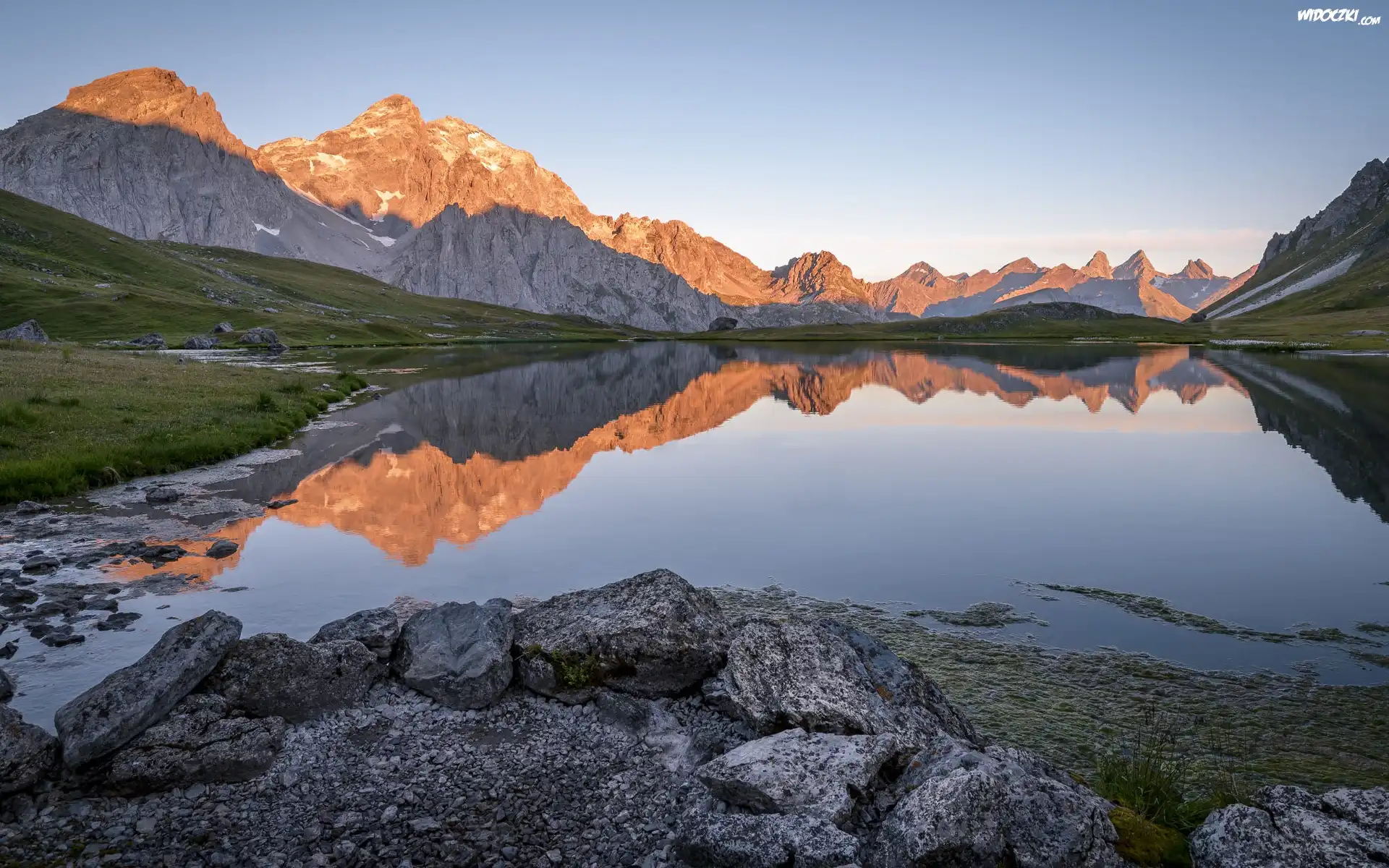 Francja, Góry, Jezioro, Lac des Cerces, Kamienie, Odbicie