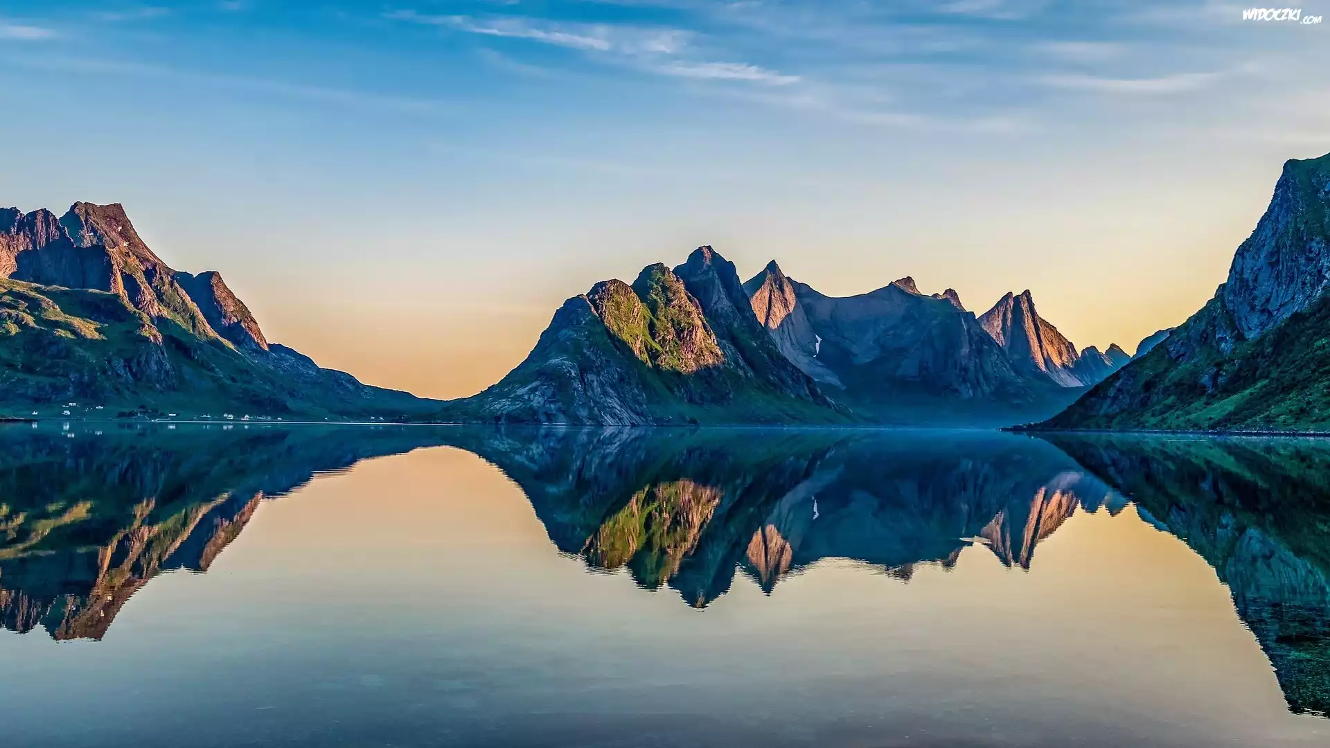 Zdjęcia, Poranek, Góry, Jezioro, Odbicie, Reinefjorden, Lofoty, Norwegia