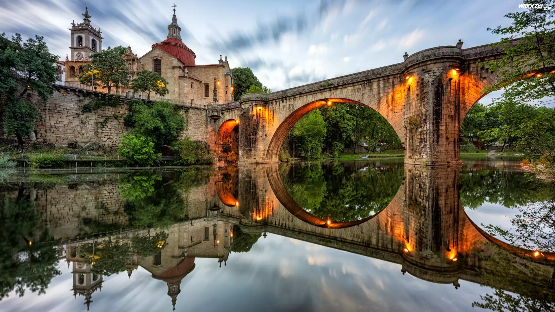 Zdjęcia, Rzeka Tamega, Most, Ponte Sao Goncalo, Kościół, Klasztor, Drzewa, Odbicie, Amarante, Portugalia