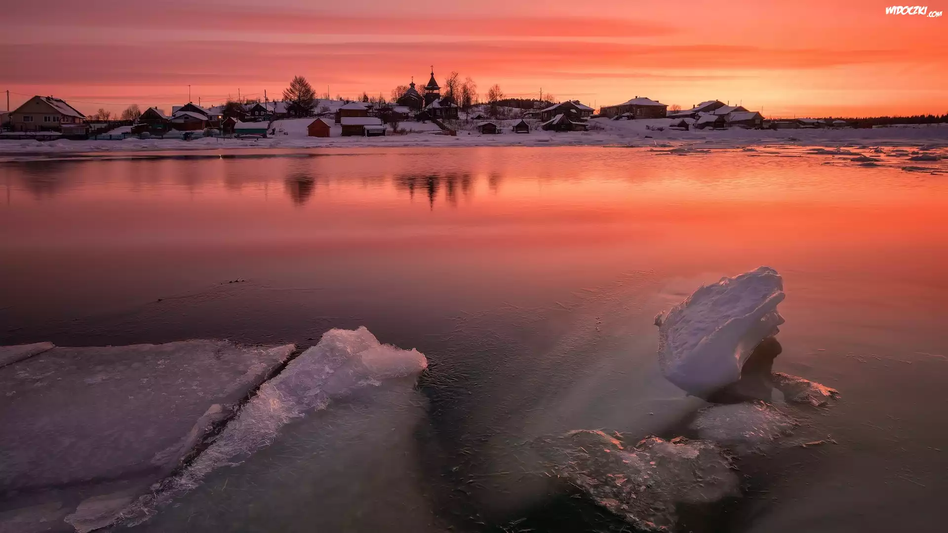 Rosja, Obwód murmański, Wieś Kowda, Zima, Rzeka, Niebo, Kolorowe, Odbicie, Kry lodowe