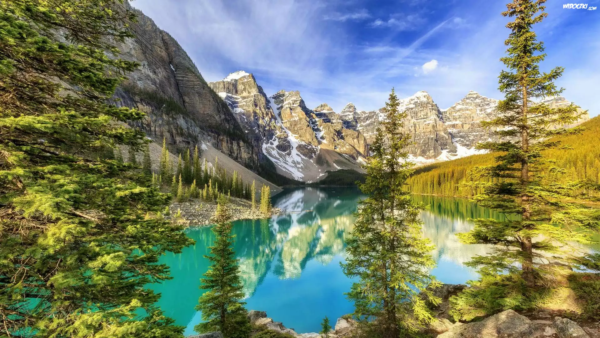 Zdj臋cia, Kanada, Alberta, Park Narodowy Banff, Jezioro Moraine, Drzewa, Odbicie