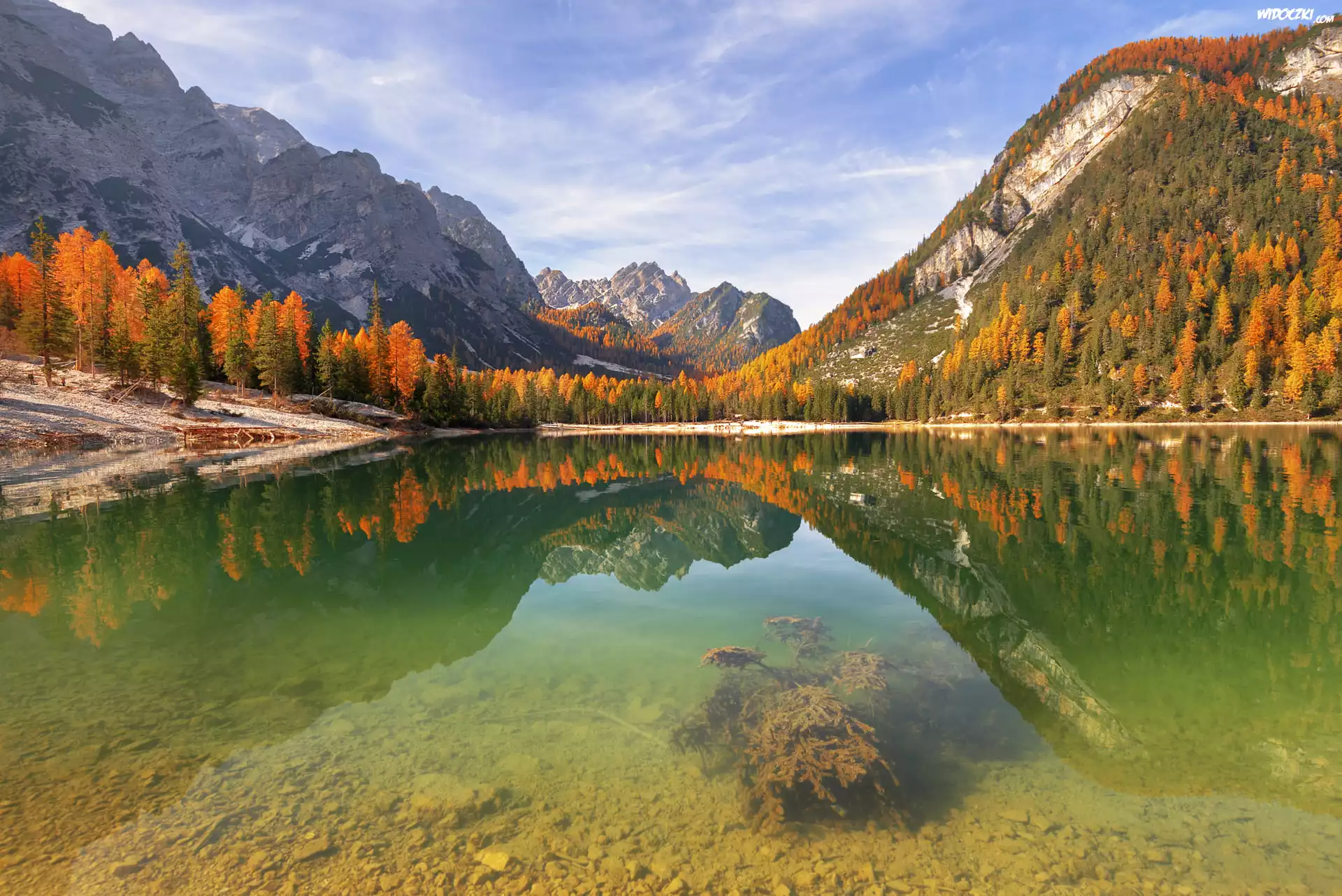 Zdjęcia, Włochy, Jezioro Pragser Wildsee, Góry, Dolomity, Jesień, Drzewa, Odbicie