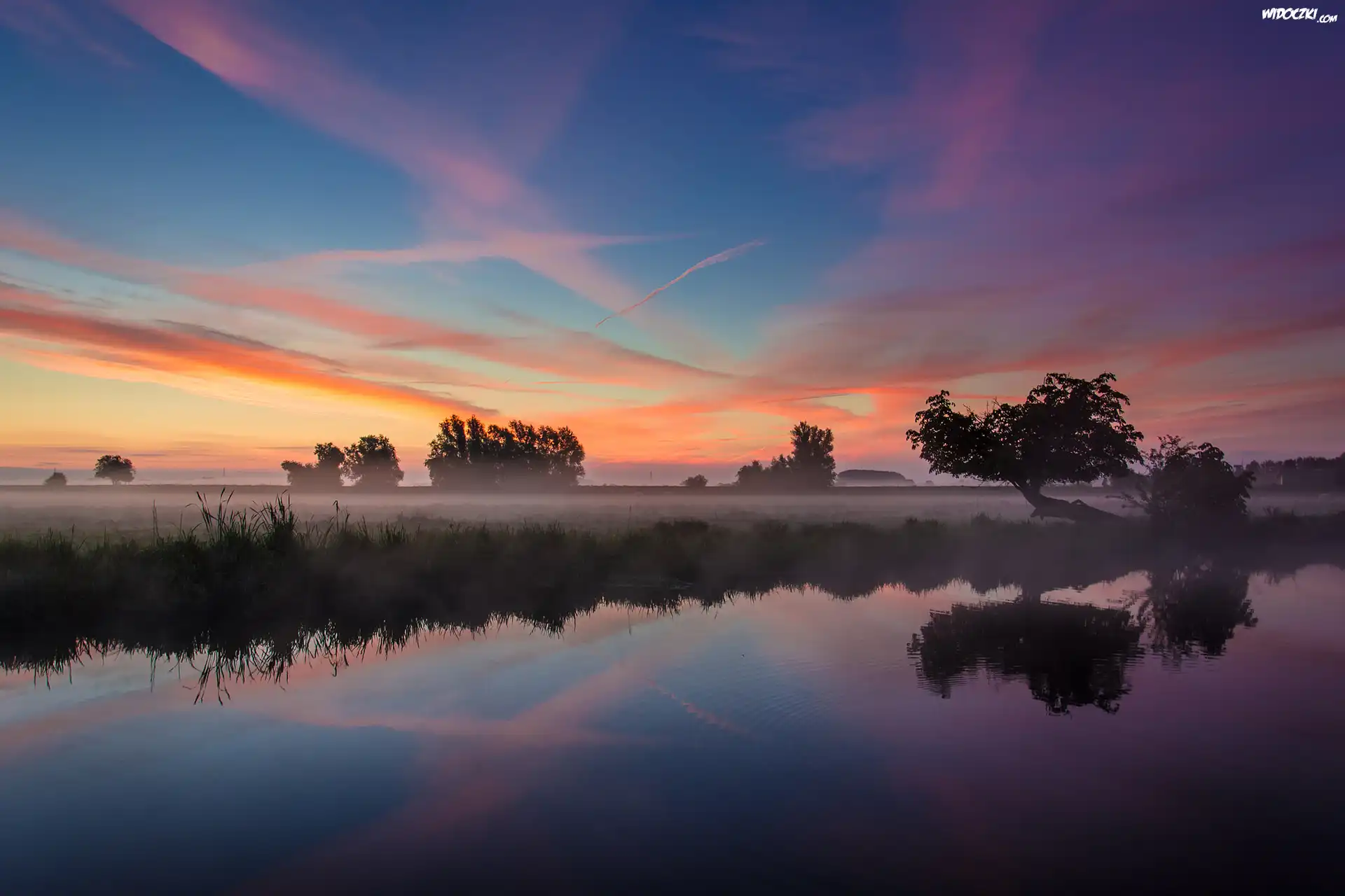 Zdjęcia, Anglia, Ely, Rzeka Ouse, Mgła, Zachód słońca, Drzewa, Odbicie