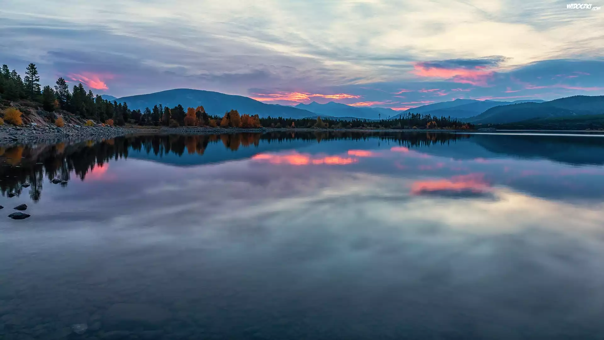 Jezioro, Dillon Lake, Góry, Drzewa, Chmury, Odbicie, Stan Kolorado, Stany Zjednoczone