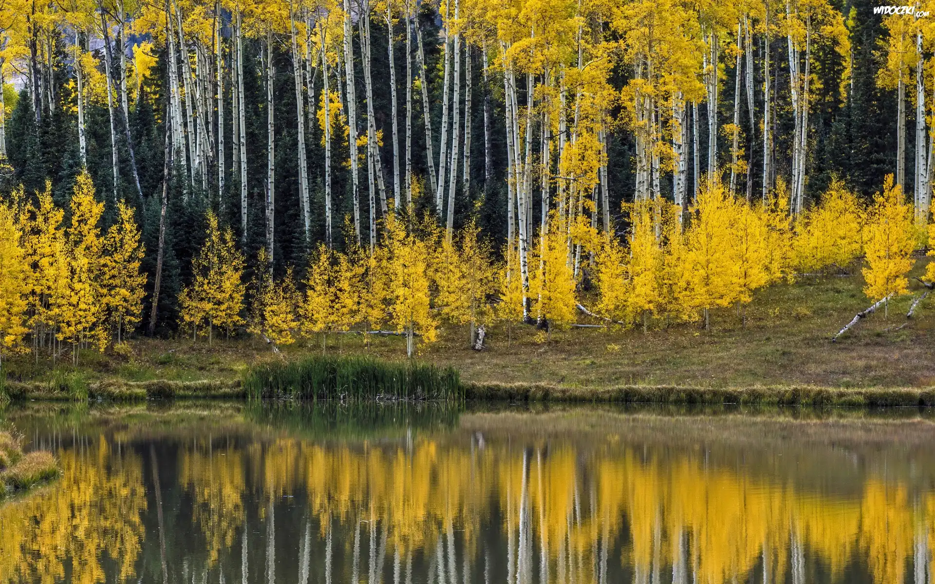 Jesień, Las, Drzewa, Odbicie, Brzeg, Staw