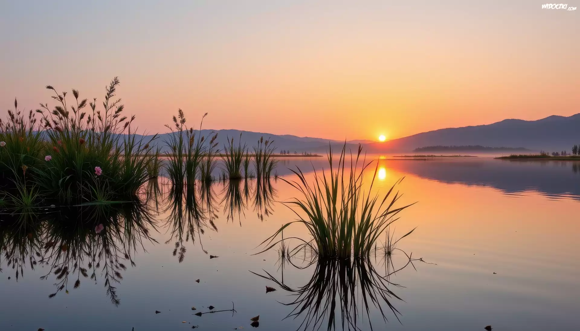 Zdjęcia, Jezioro, Szuwary, Trawy, Odbicie, Zachód słońca, Góry