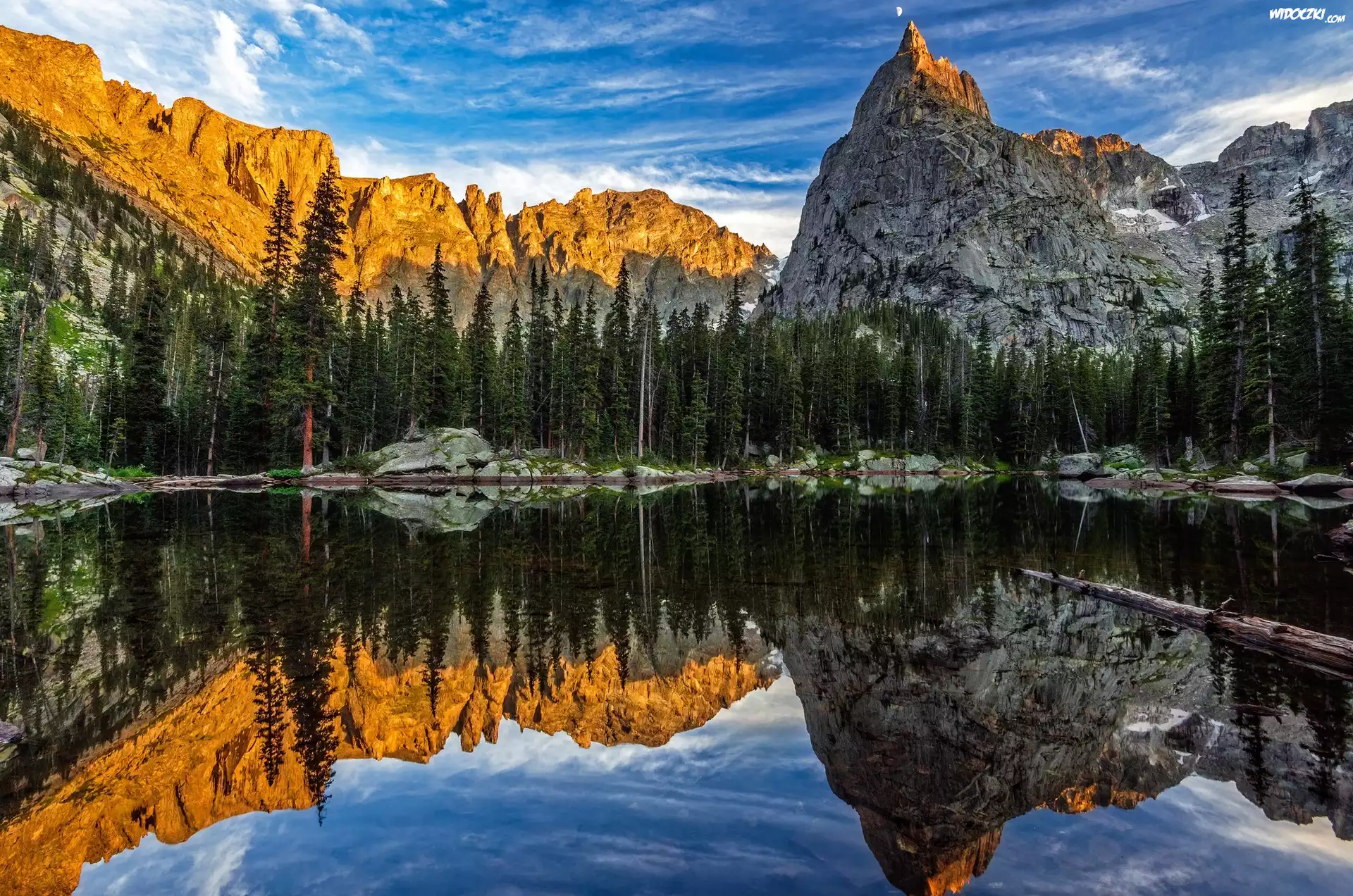 Góry, Szczyt, Lone Eagle Peak, Indian Peaks Wilderness, Stan Kolorado, Stany Zjednoczone, Jezioro, Mirror Lake, Drzewa, Odbicie |