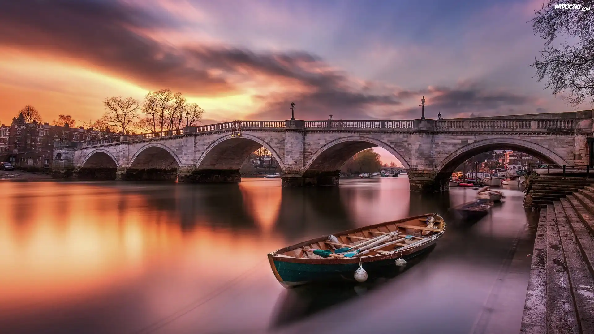 Zdjęcia, Rzeka Tamiza, Most, Richmond Bridge, Łódka, Drzewa, Zachód słońca, Chmury, Richmond, Anglia
