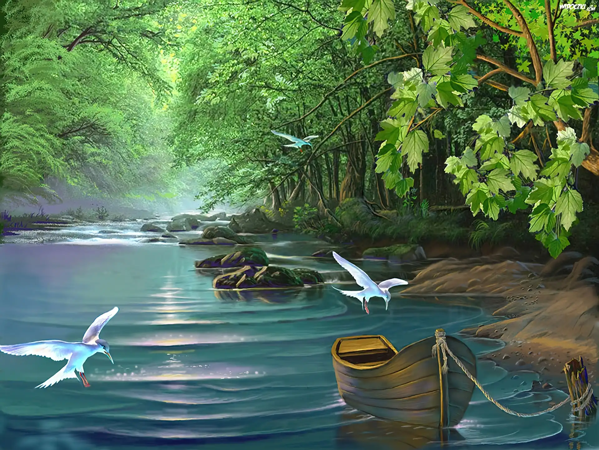 Rzeka, Łódka, Ptaki