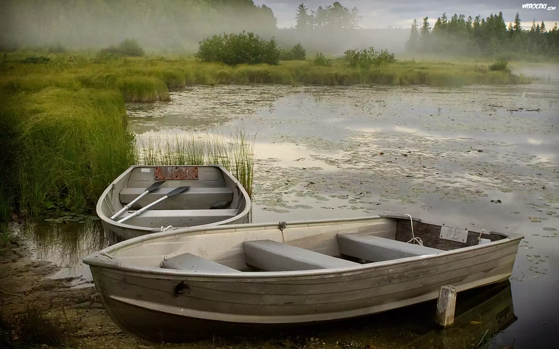 Łódki, Dwie, Wiosła, Jezioro, Szuwary, Mgła