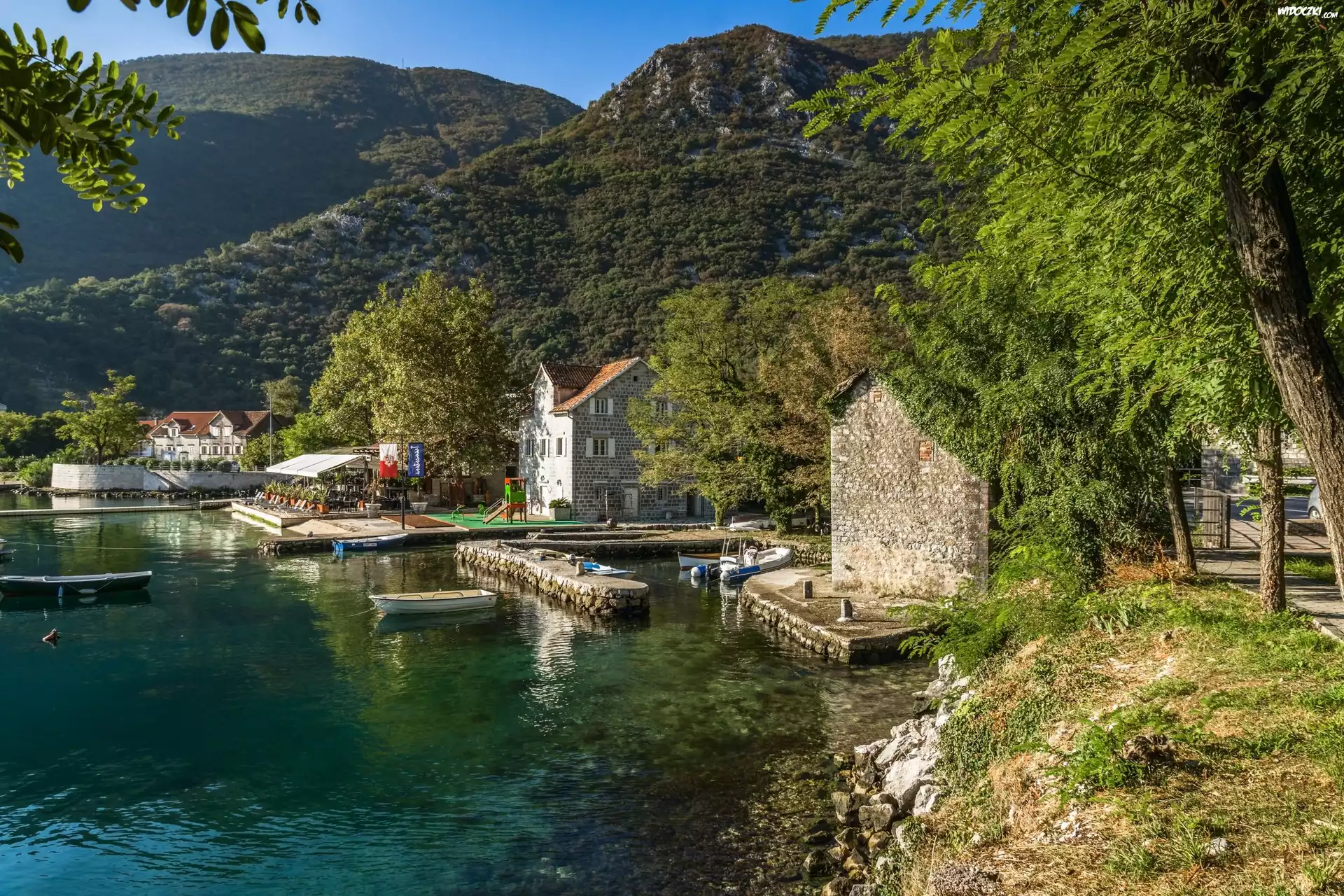 Czarnogóra, Zatoka Kotorska, Morinj, Domy, Góry, Drzewa, Jezioro, Łódki