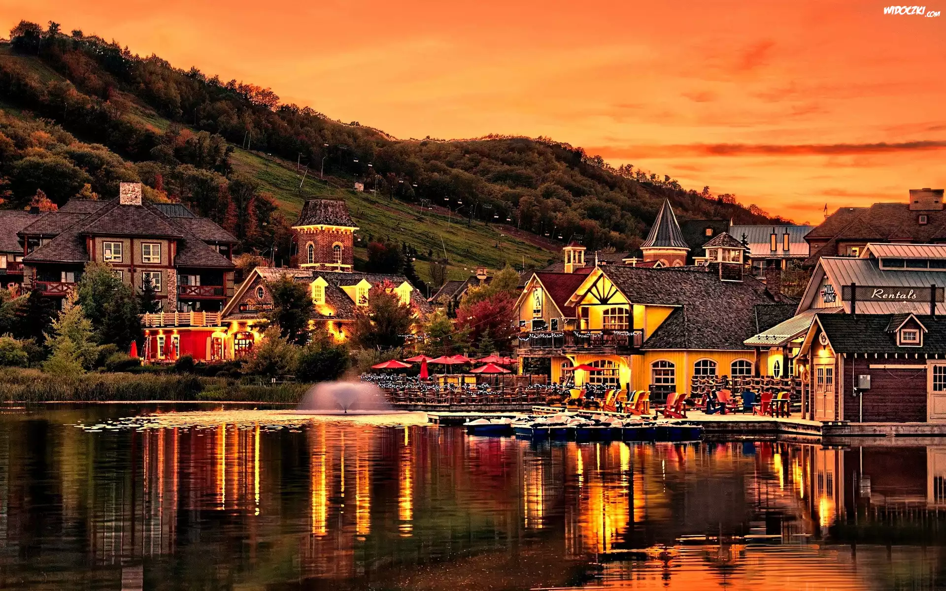 Zdjęcia, Jezioro, Łódki, Fontanna, Góry, Osada, Turystyczna, Zachód, Słońca