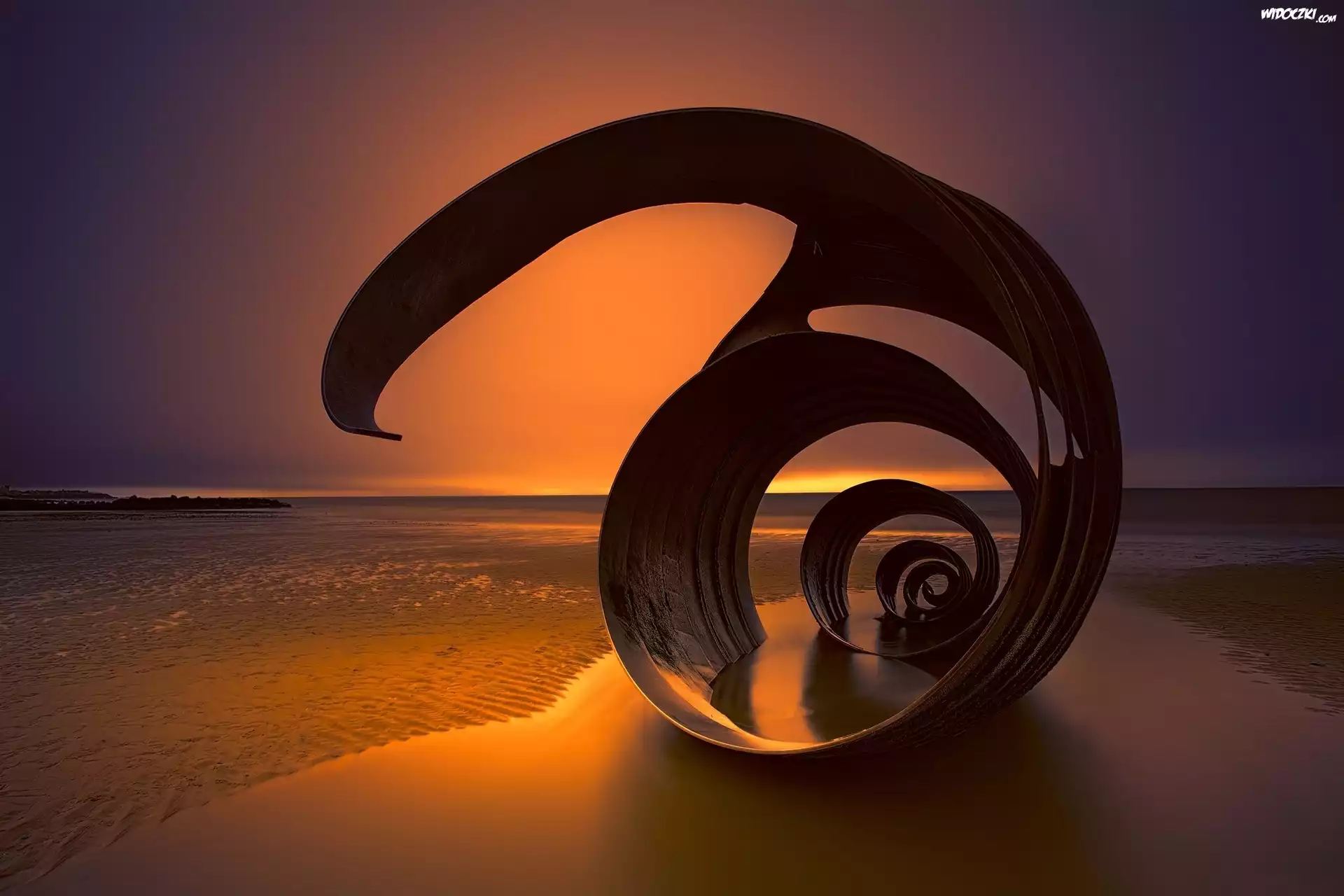 Zdjęcia, Morze, Odpływ, Plaża, Zachód Słońca, Metalowa, Spirala