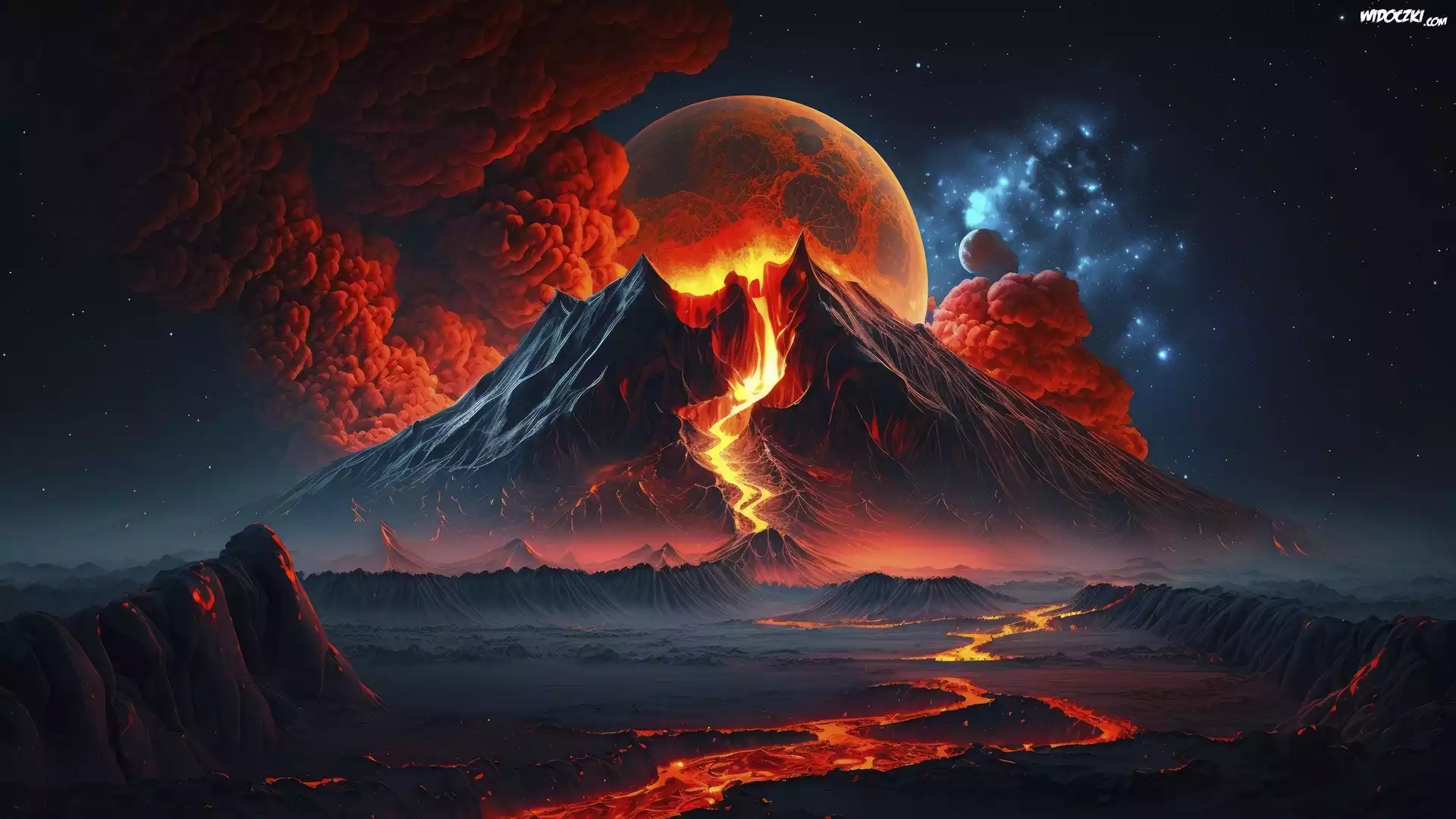 Noc, Wulkan, Erupcja, Ogień, Dym, Księżyc, AI