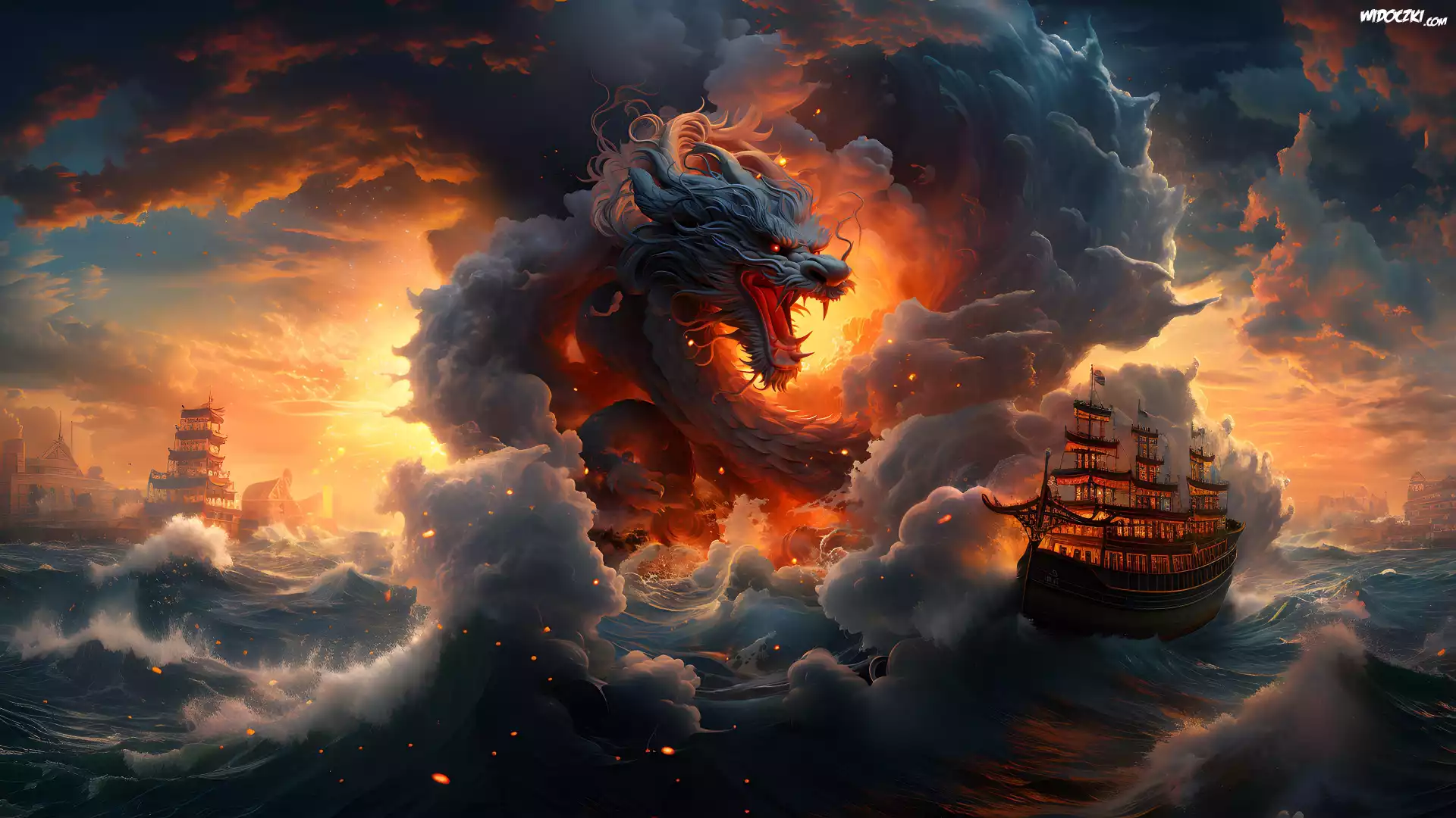 Morze, Żaglowiec, Chmury, Ogień, Smok, Fantasy
