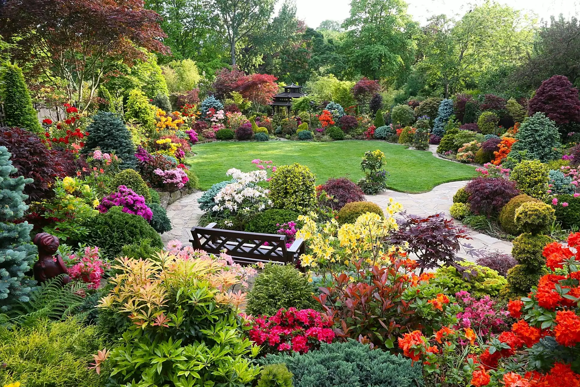 Ogród, Krzewy, Kolorowe, Kwiaty, Ławka