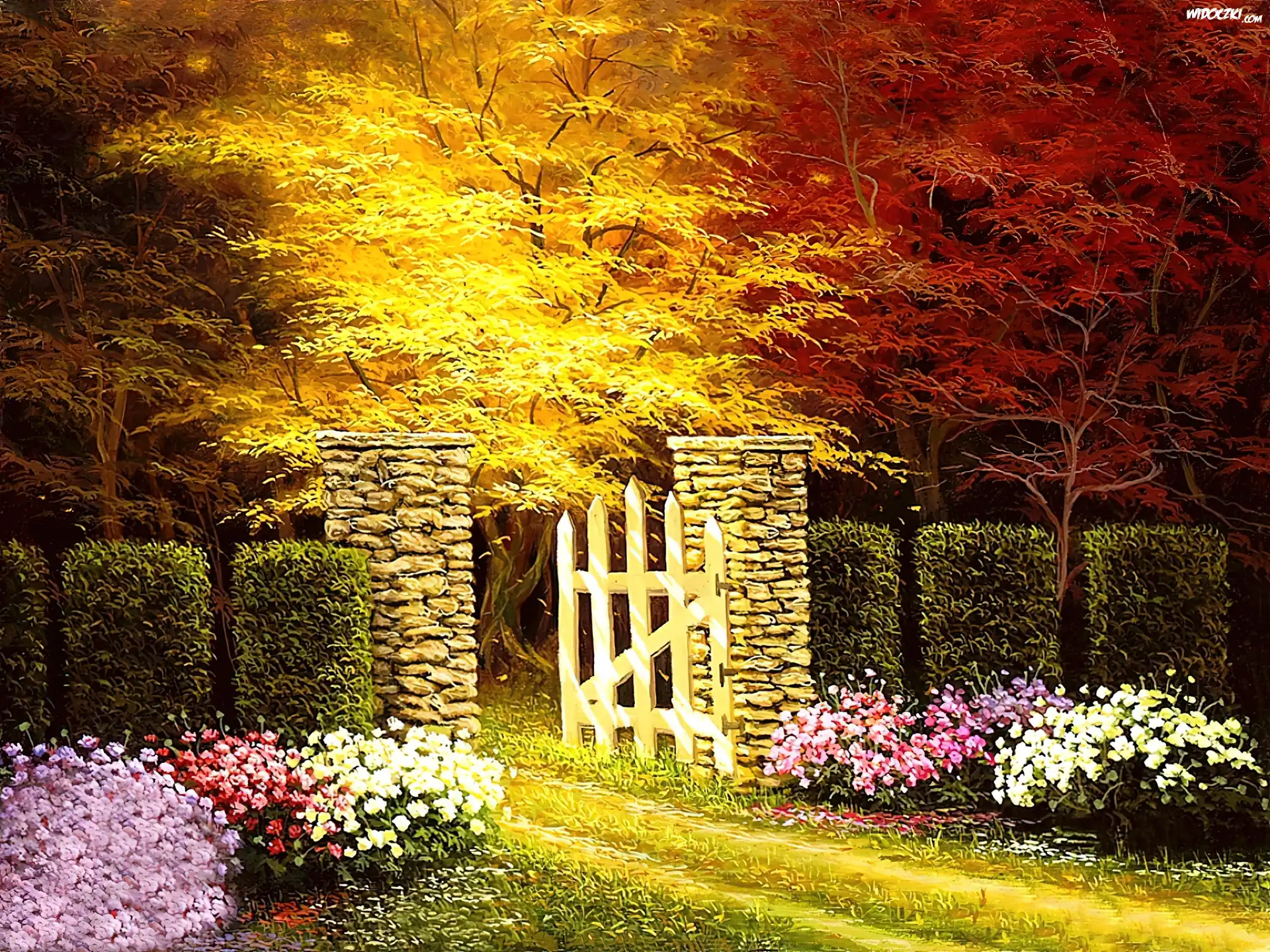 Zdjęcia, Ogród, Droga, Bramka, Kwiaty