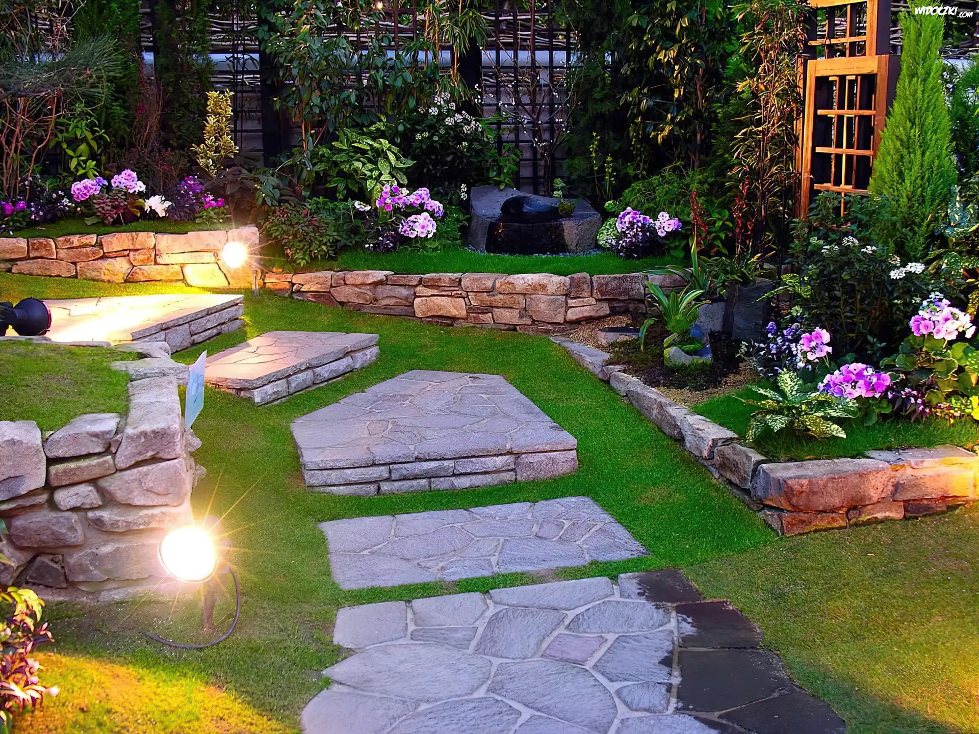 Zdjęcia, Ogród, Kwiaty, Ścieżka, Murek