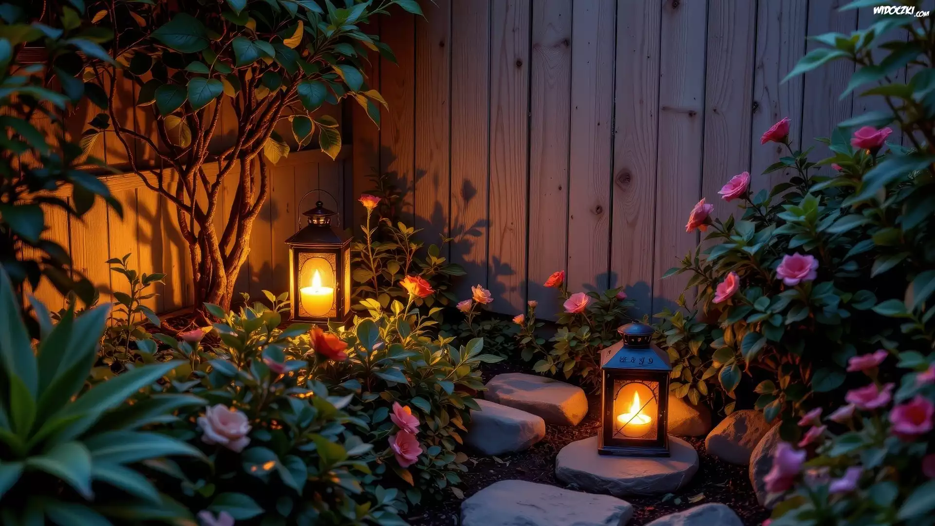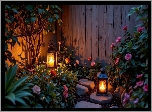 Ogród, Różowe, Kwiaty, Dwa, Lampiony, Ściana, Deski, Płaskie, Kamienie