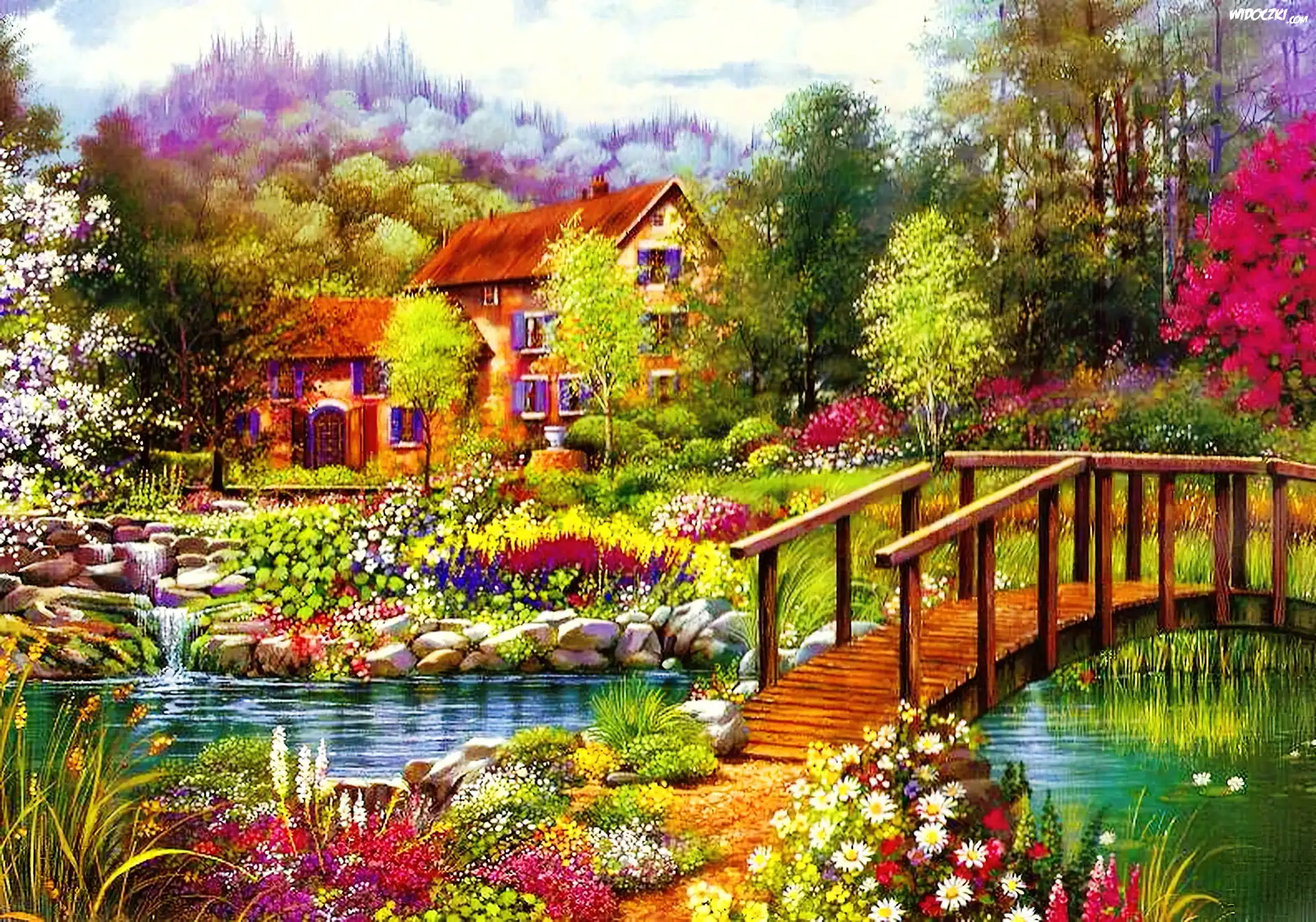 Zdjęcia, Ogród, Mostek, Rzeka, Dom, Kwiaty