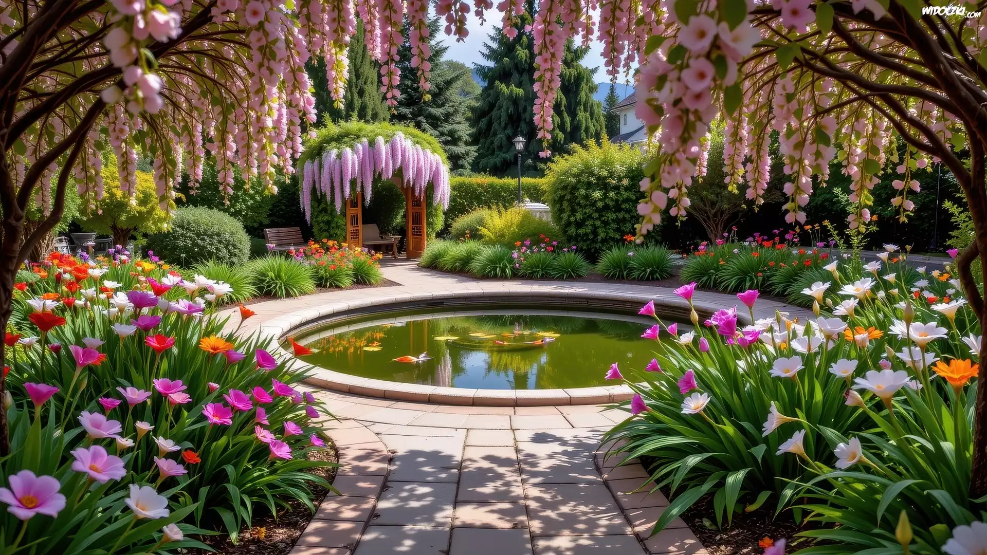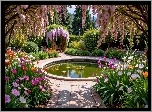 Zdjęcia, Ogród, Oczko, Wodne, Krzewy, Kolorowe, Kwiaty, Drzewa, Pergola, Ławki