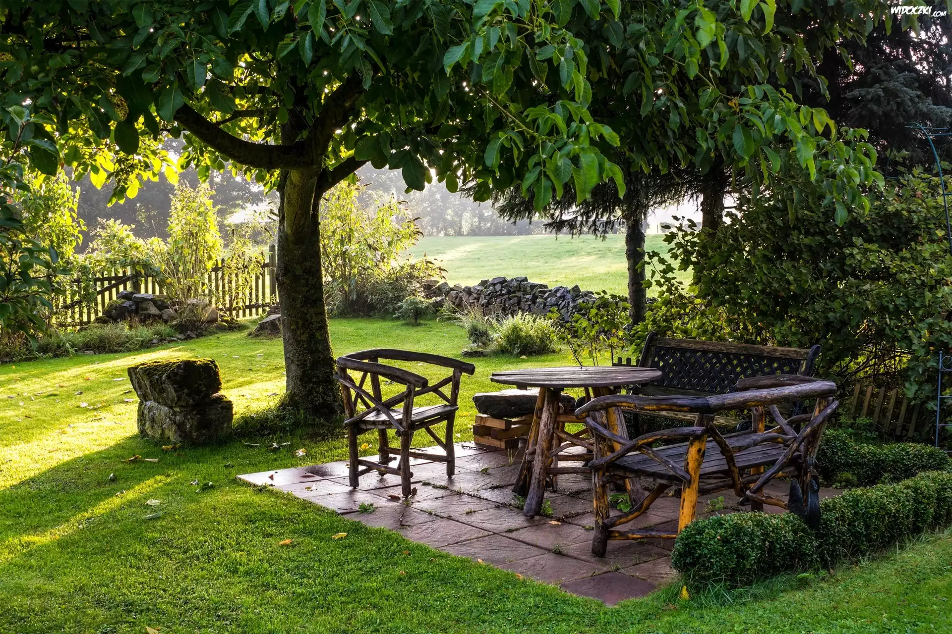 Zdjęcia, Ogród, Meble, Drzewa, Relaks