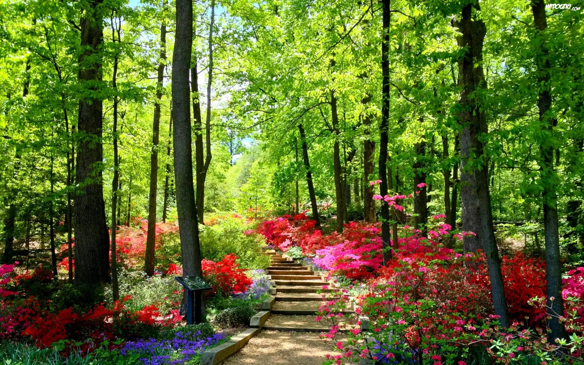 Zdjęcia, Ogród, Schody, Drzewa, Kwiaty