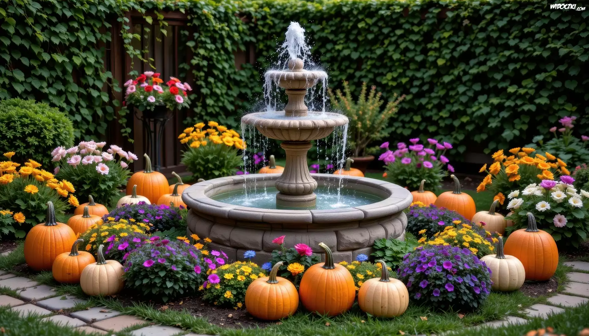 Dynie, Kwiaty, Fontanna, Ogród