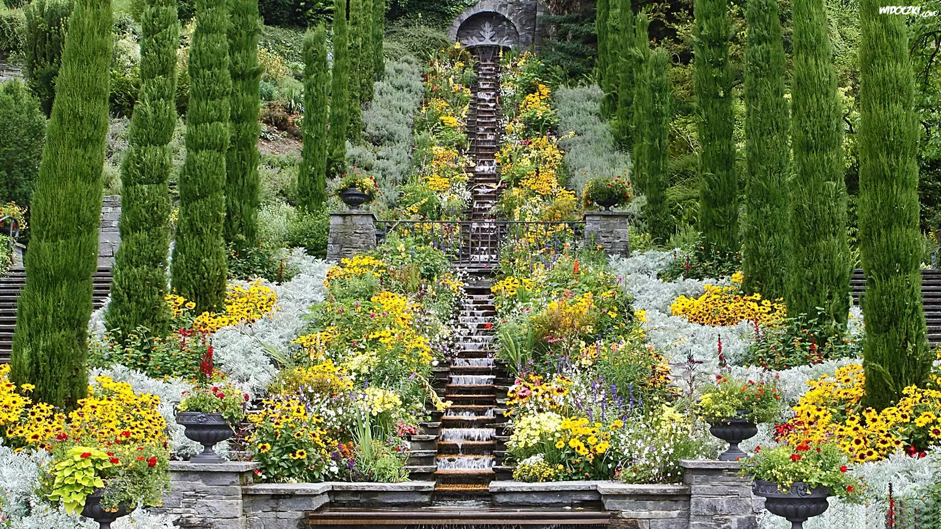 Ogród, Kolorowe, Kwiaty, Iglaki, Kaskada