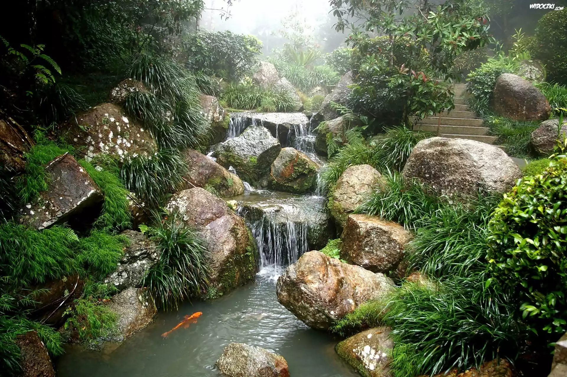 Zdjęcia, Ogród, Zen, Kaskada, Sadzawka, Karp, Koi