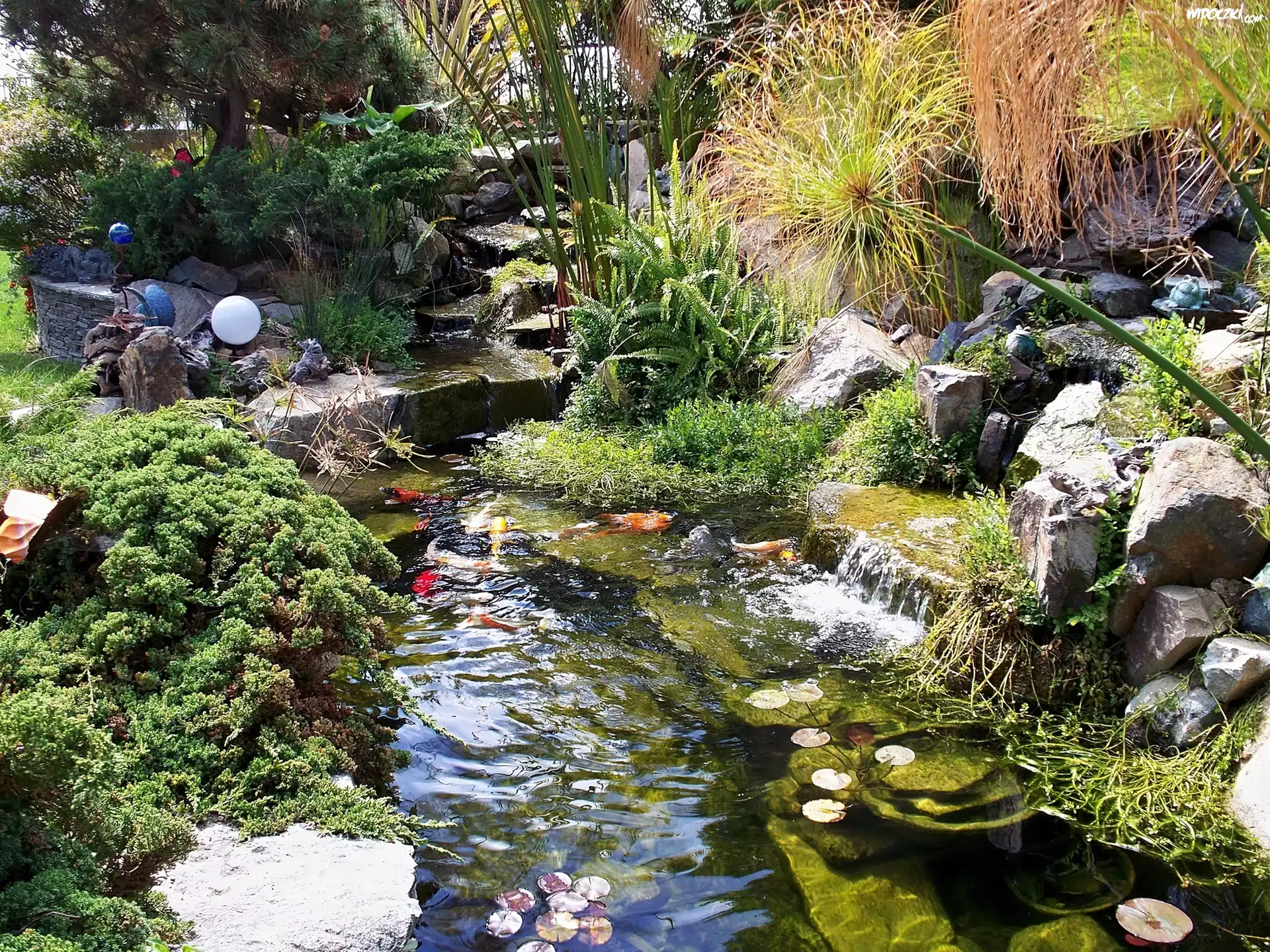 Zdjęcia, Ogród, Skalniak, Kaskada, Ryby