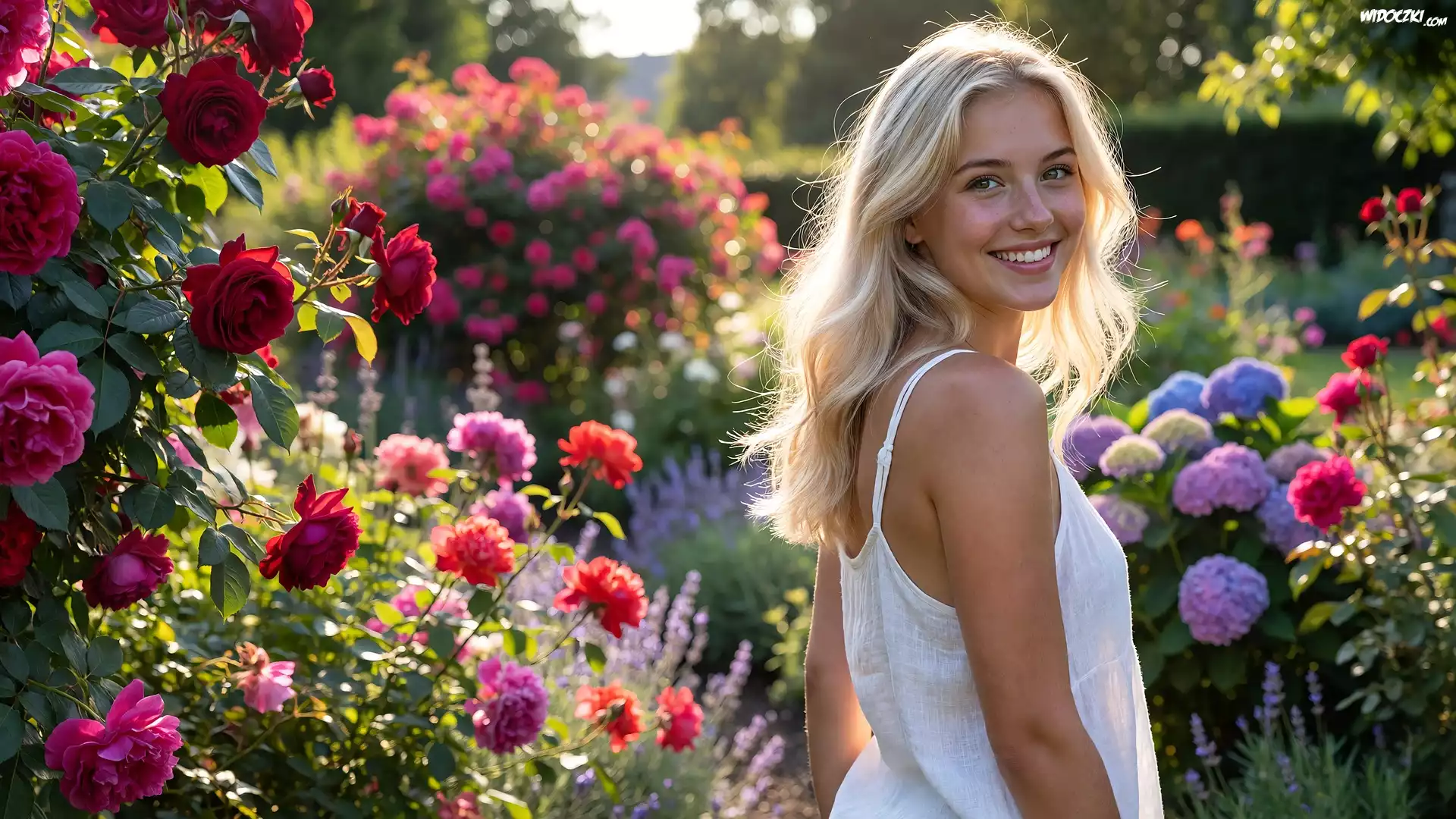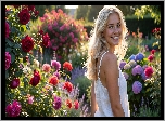 Zdjęcia, Kobieta, Blondynka, Kwiaty, Ogród