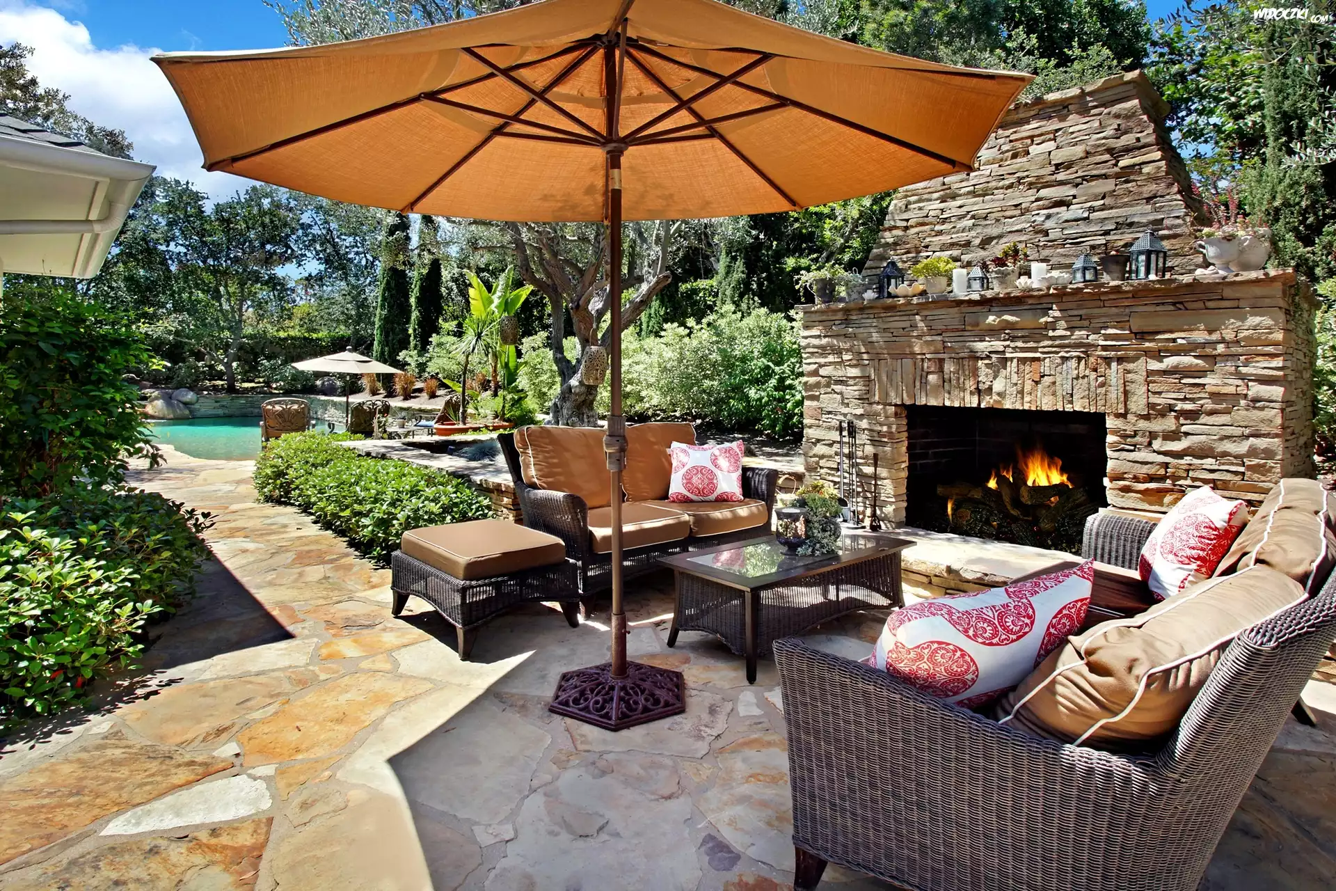 Zdjęcia, Ogród, Taras, Parasol, Kominek, Relaks