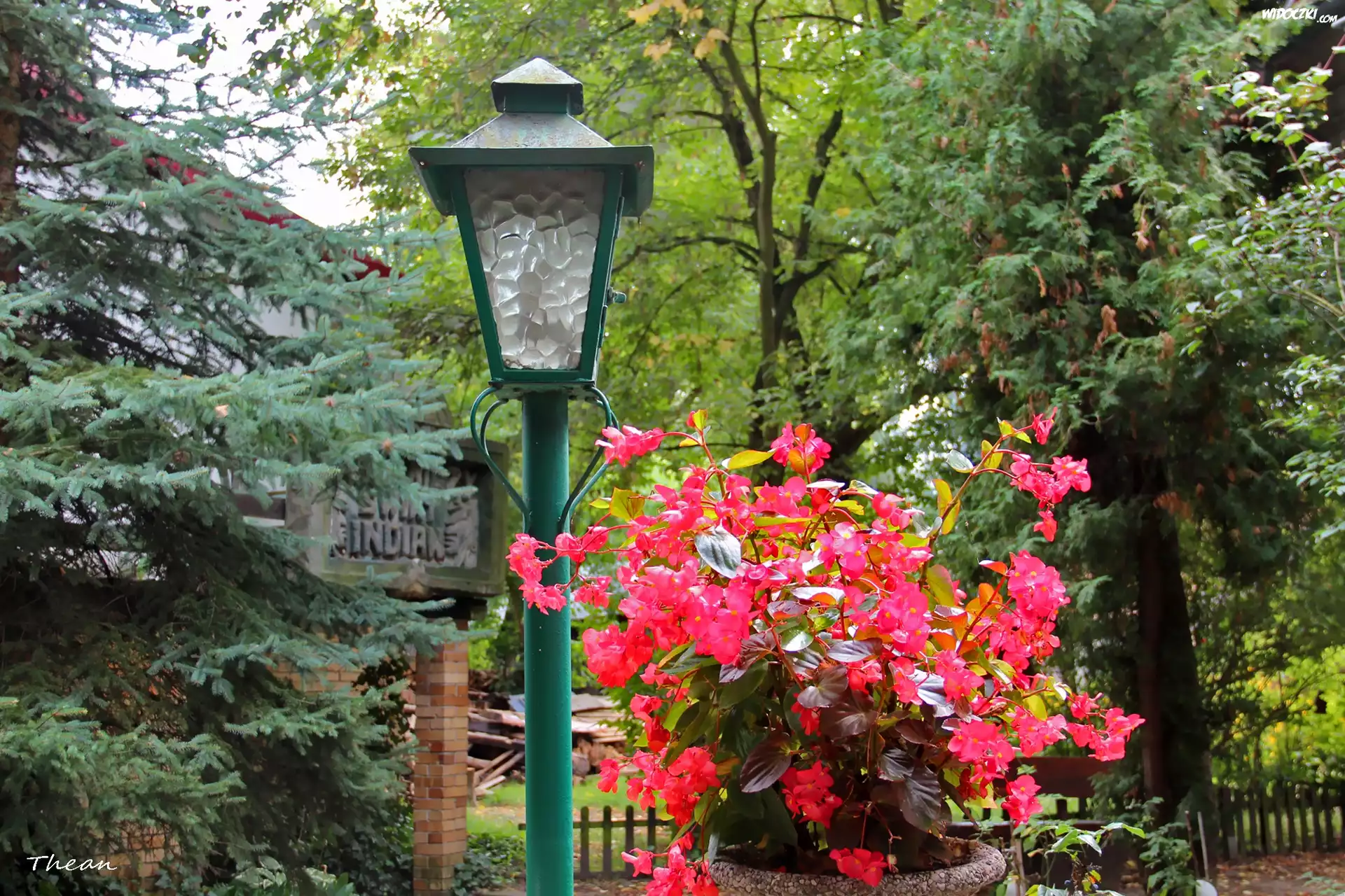 Zdjęcia, Ogród, Drzewa, Kwiaty, Latarnia