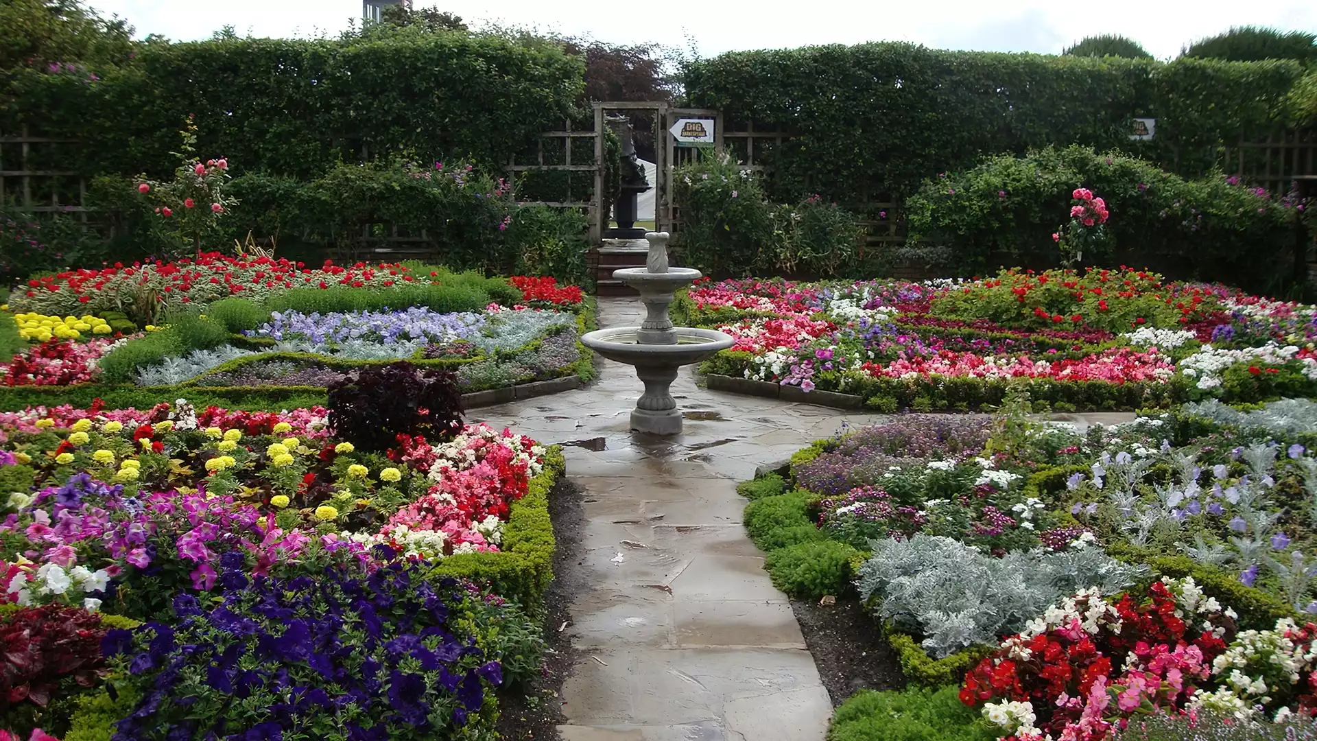 Zdjęcia, Kwiaty, Ogród, Fontanna