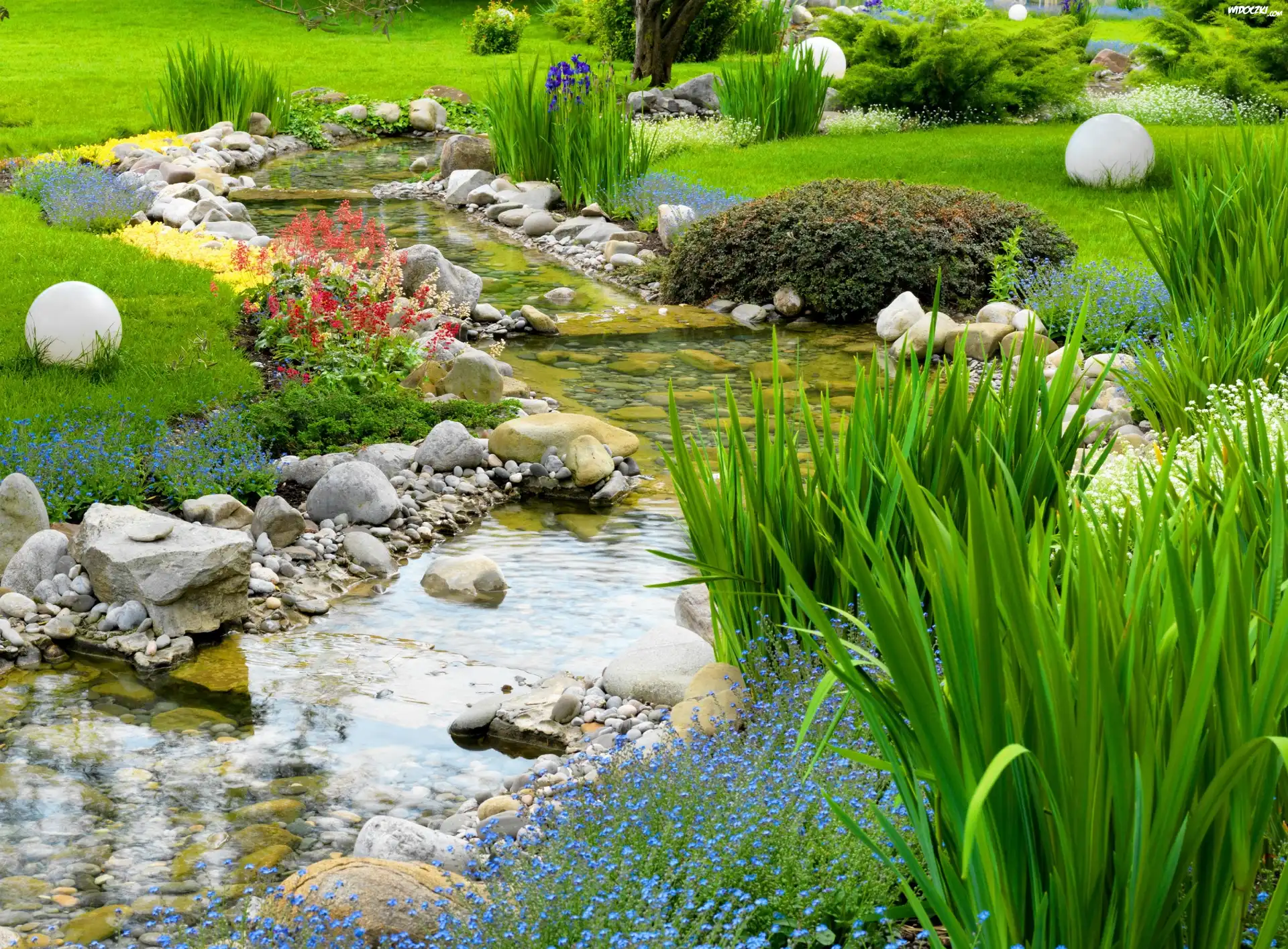 Ogród, Rzeczka, Kamienie, Kwiaty, Klomby
