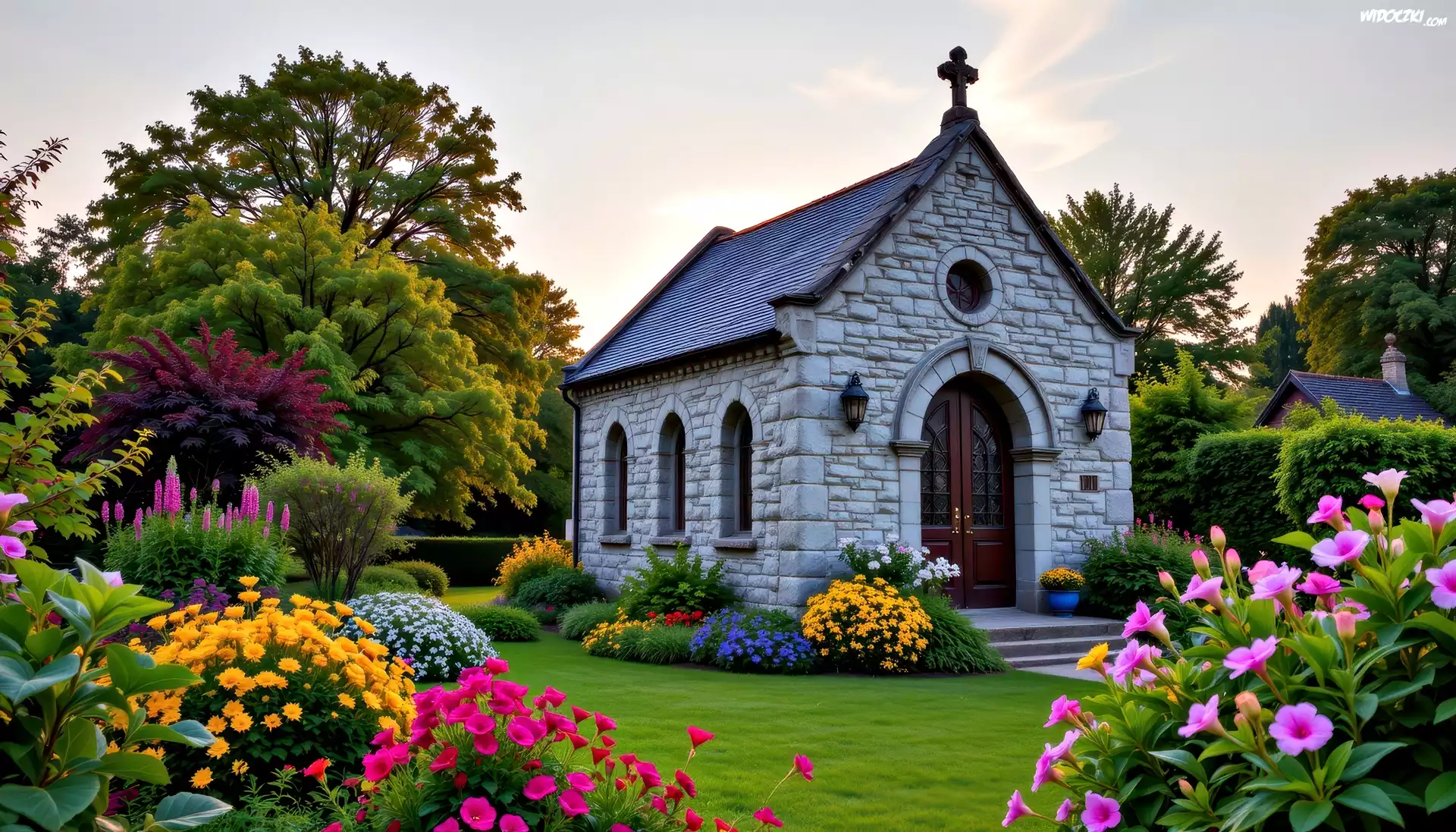 Zdjęcia, Kaplica, Kościół, Kwiaty, Ogród, Drzewa, Grafika AI