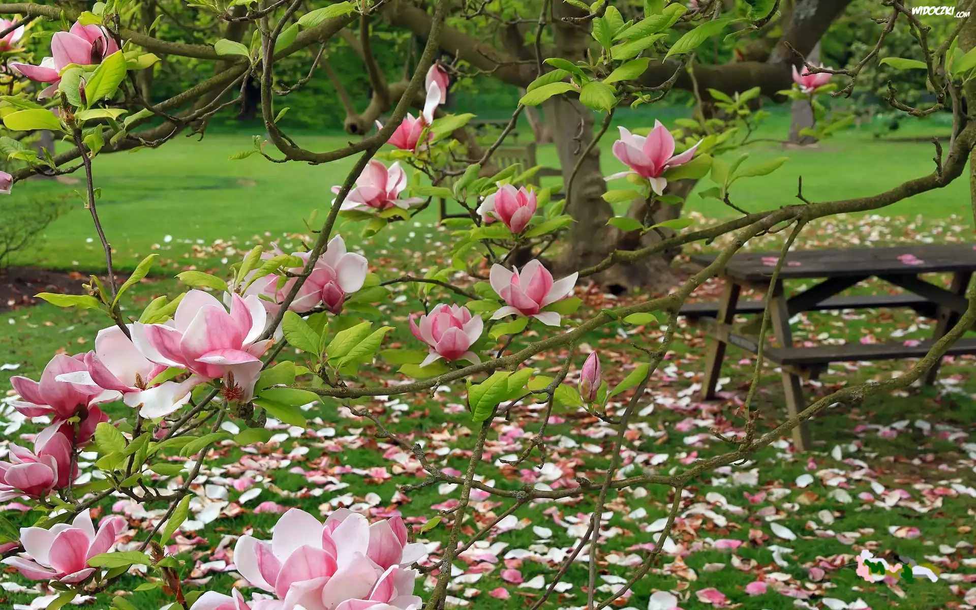 Zdjęcia, Ogród, Różowa, Magnolia, Stolik