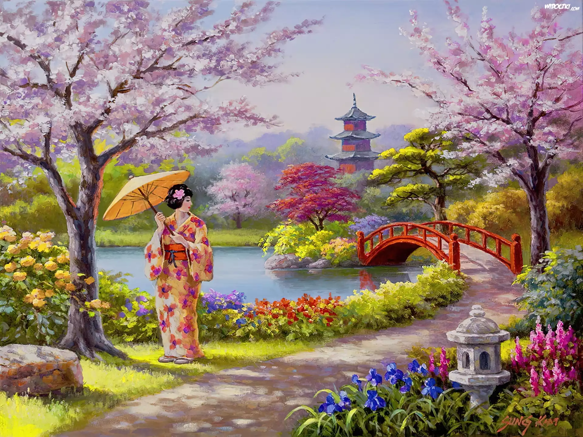 Ogród, Japonka, Kobieta, Rzeka, Most, Kwiaty