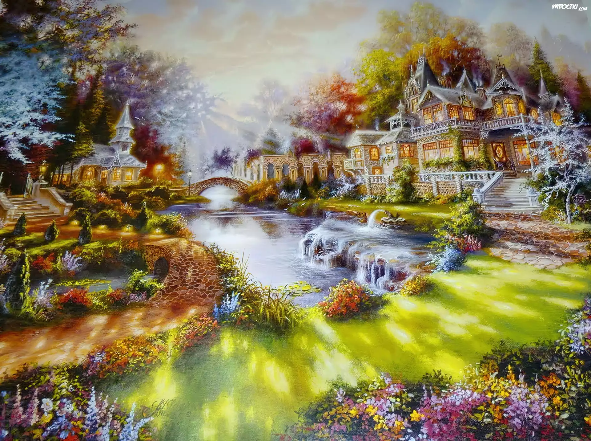Zdjęcia, Ogród, Domy, Mostek, Kwiaty