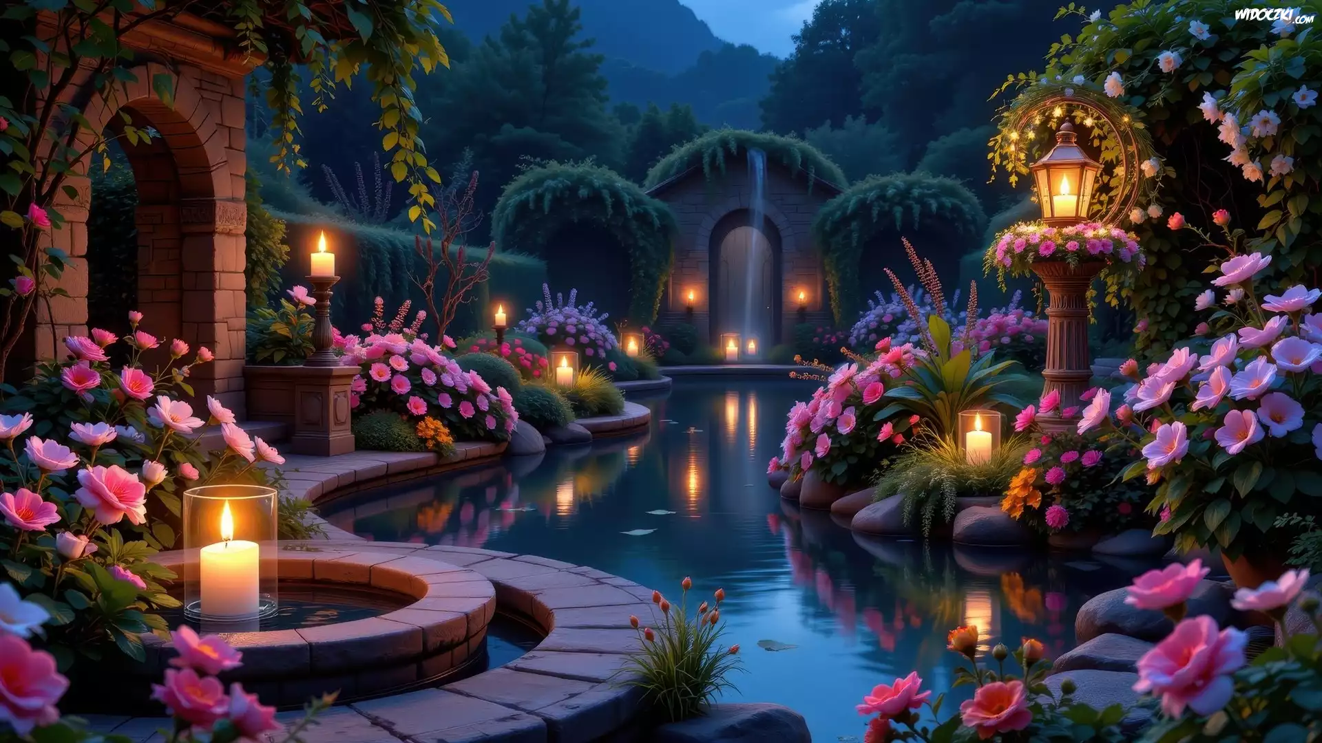 Zdjęcia, Ogród, Oczko wodne, Świece, Lampion, Różowe, Kwiaty, Rośliny, Murowany, Łuk