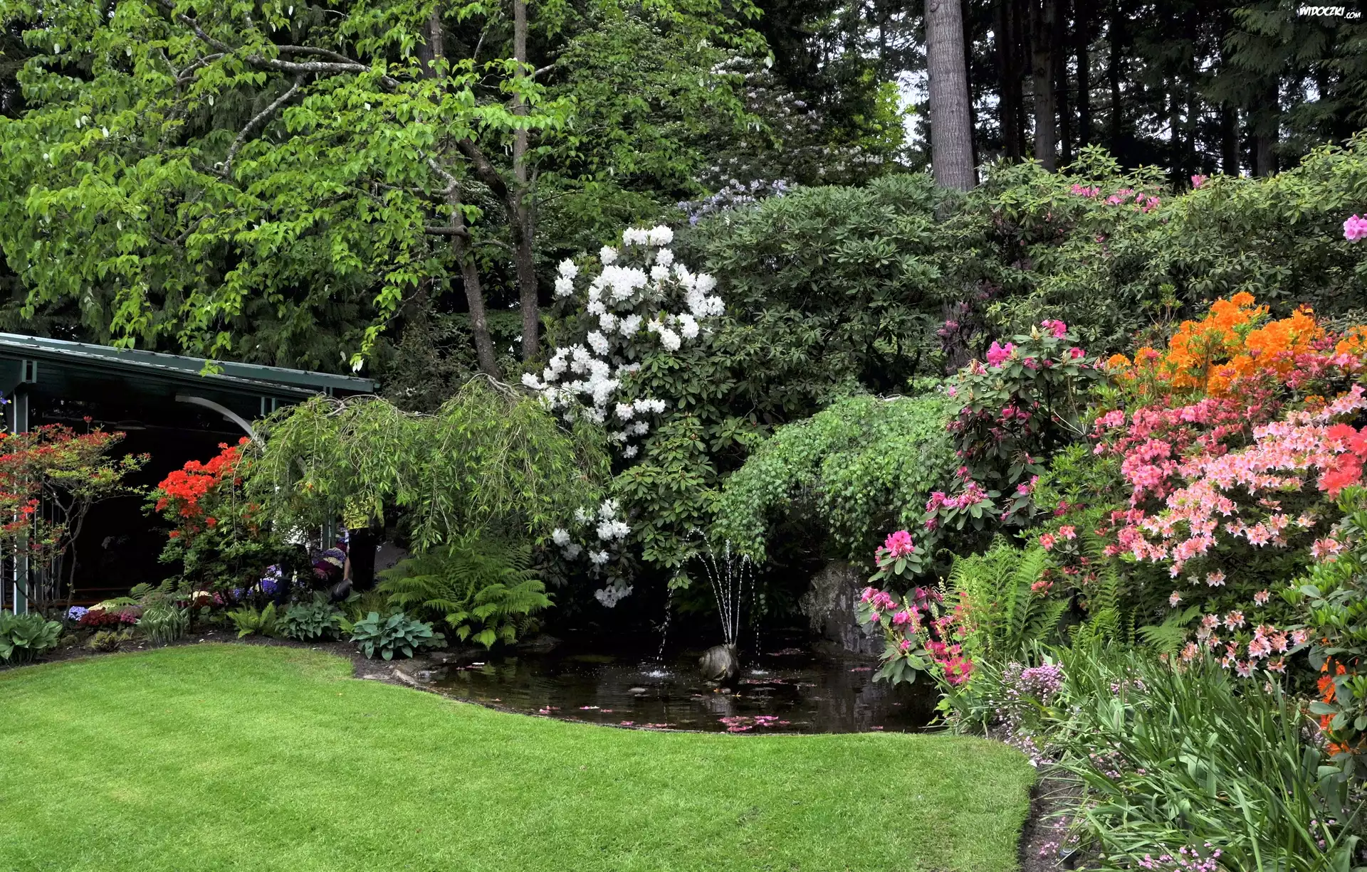 Ogród, Piękne, Kwitnące, Krzewy, Oczko, Wodne